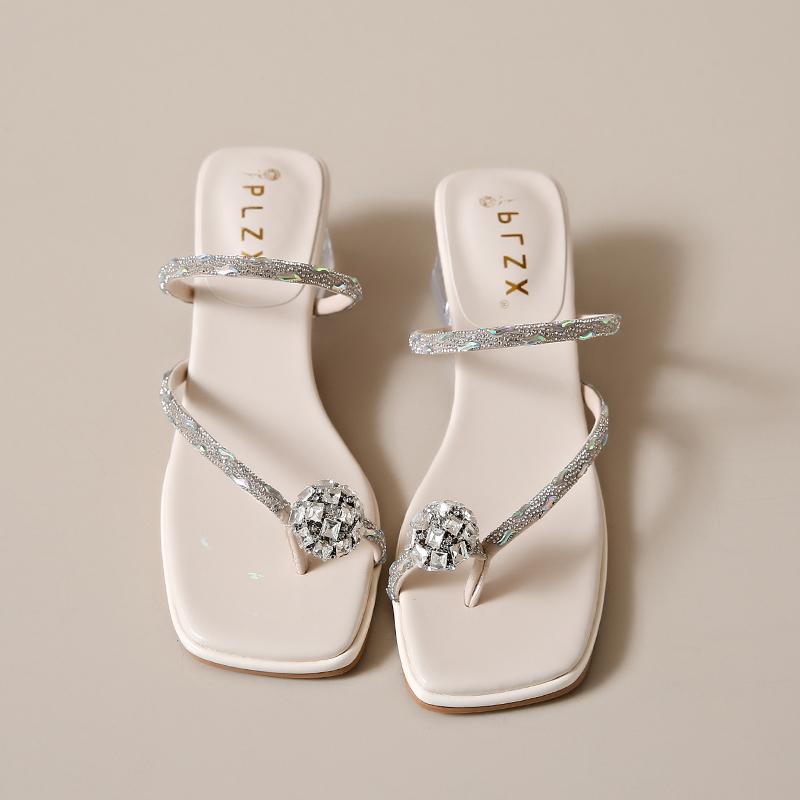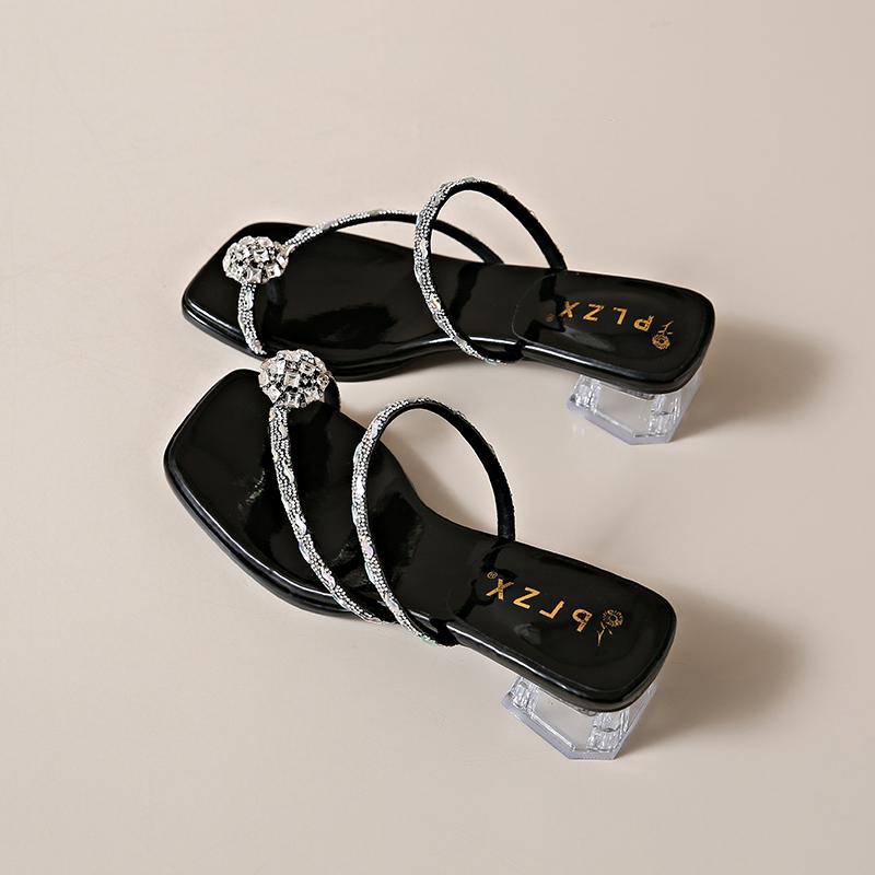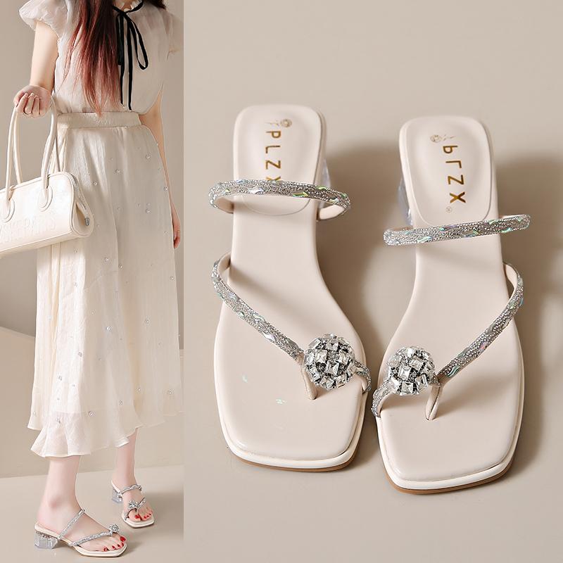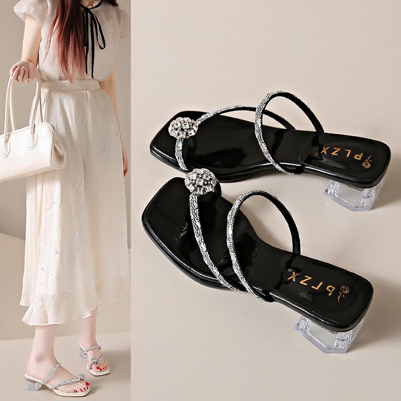 Летние новые босоножки на толстом каблуке квадратные тапочки со стразами модные тапочки прозрачные с роскошным зажимом шлепанцы