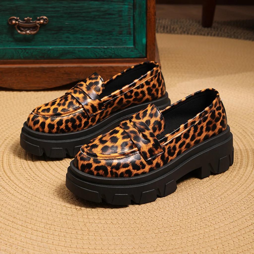 Женские туфли большого размера с низким верхом и леопардовым принтом в британском стиле, кожаные мокасины с толстой подошвой, удобная повседневная обувь для отдыха на природе