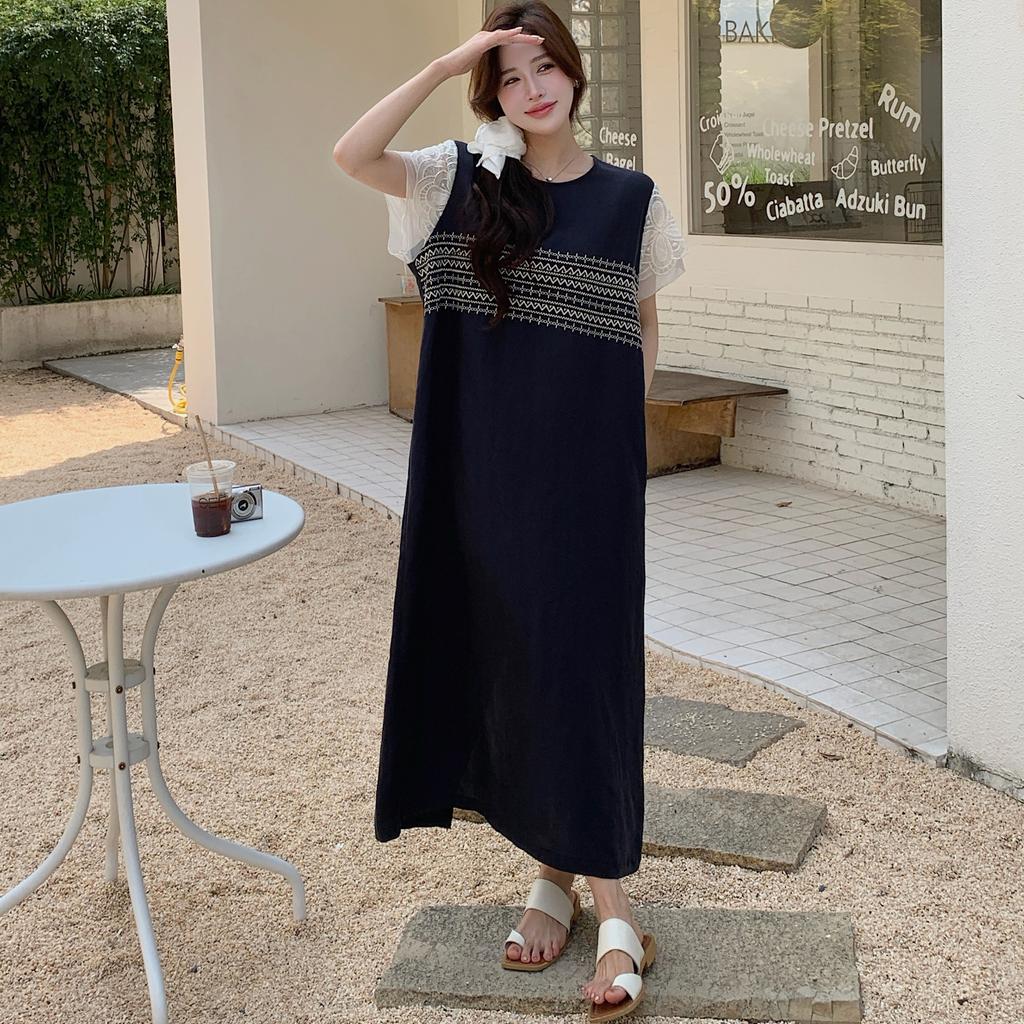 Dimanaf 2025 Летнее платье больших размеров для женщин, свободное, с коротким рукавом, мягкое кружевное, сшитое, повседневное, базовое, большого размера, длинное платье