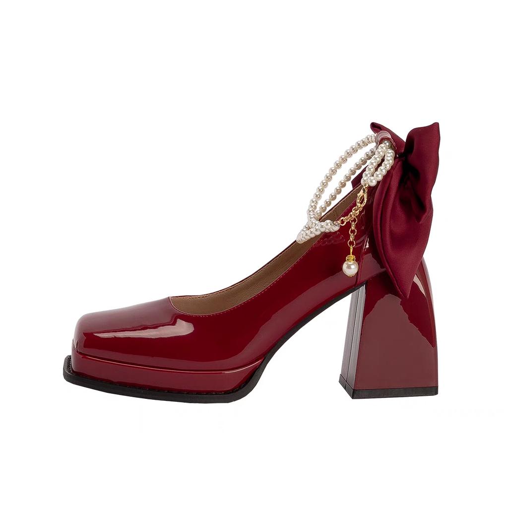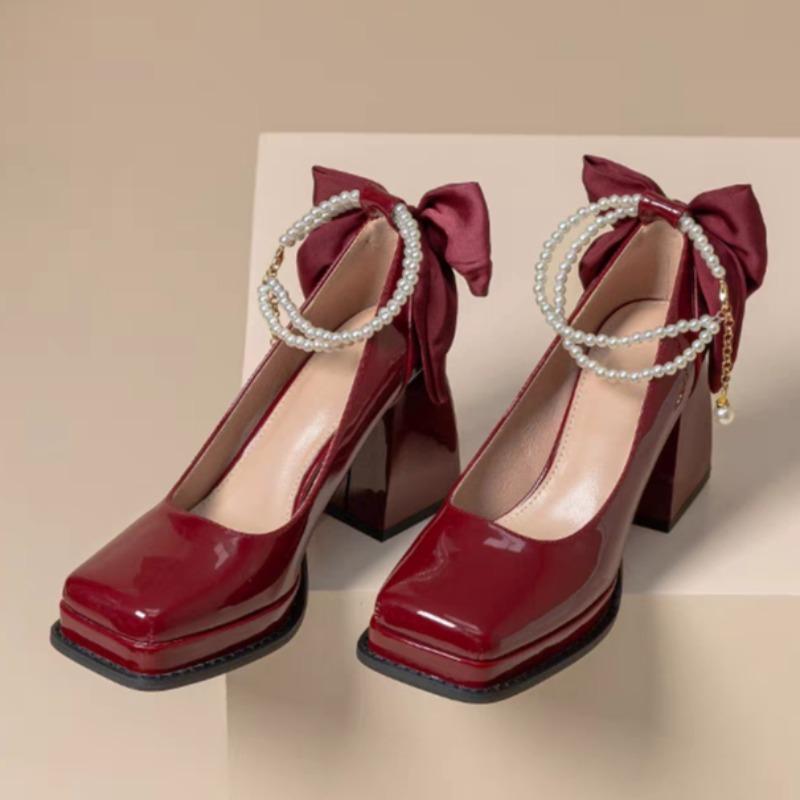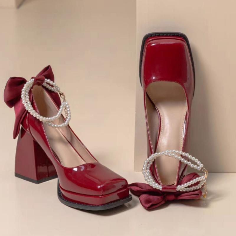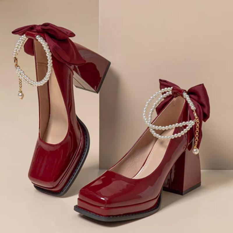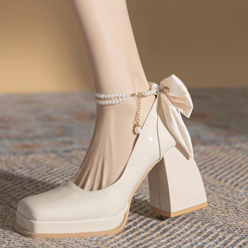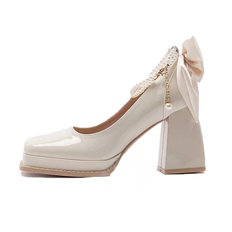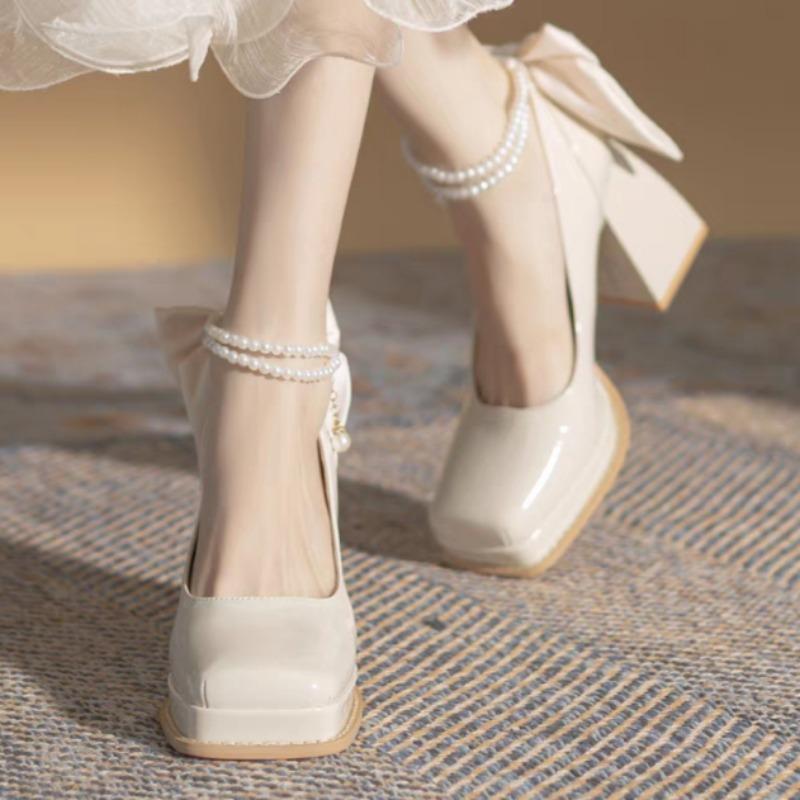 Женские туфли-лодочки Новые туфли Мэри Джейн на платформе с жемчужным бантом Женские трендовые туфли на высоком толстом каблуке Роскошные элегантные свадебные туфли для невесты