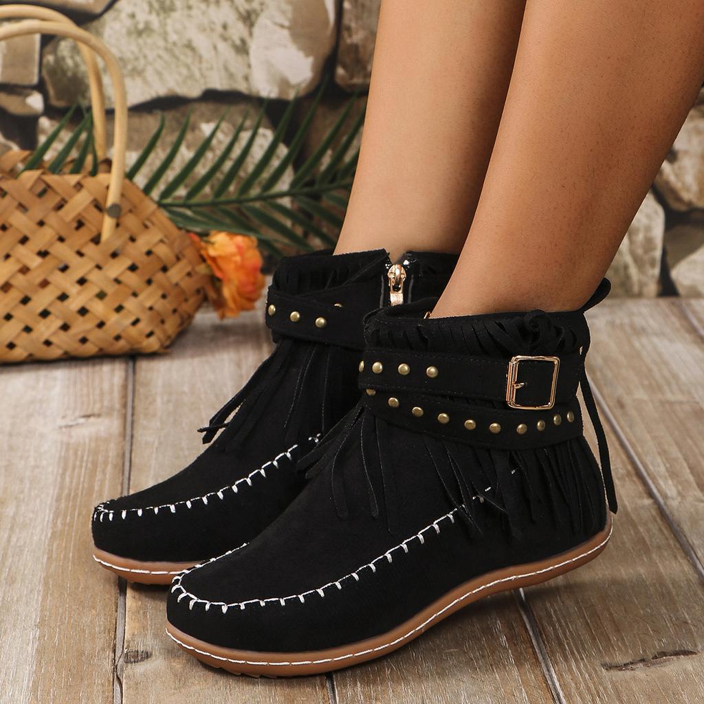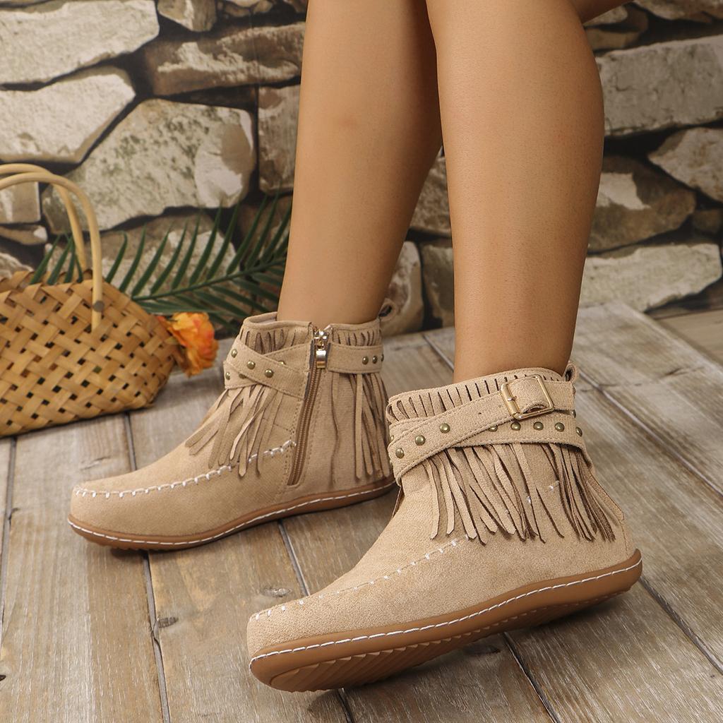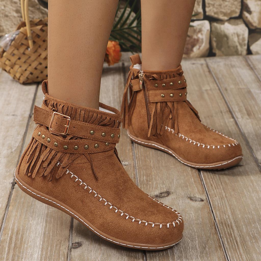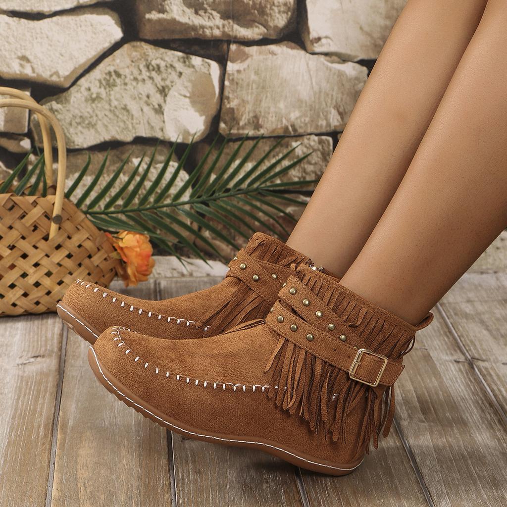 Женские ботинки, новые винтажные замшевые ботильоны с бахромой, женская обувь, зимние повседневные ботинки с застежкой-молнией сбоку, с круглым носком, женские ботинки для снега Botas De Mujer