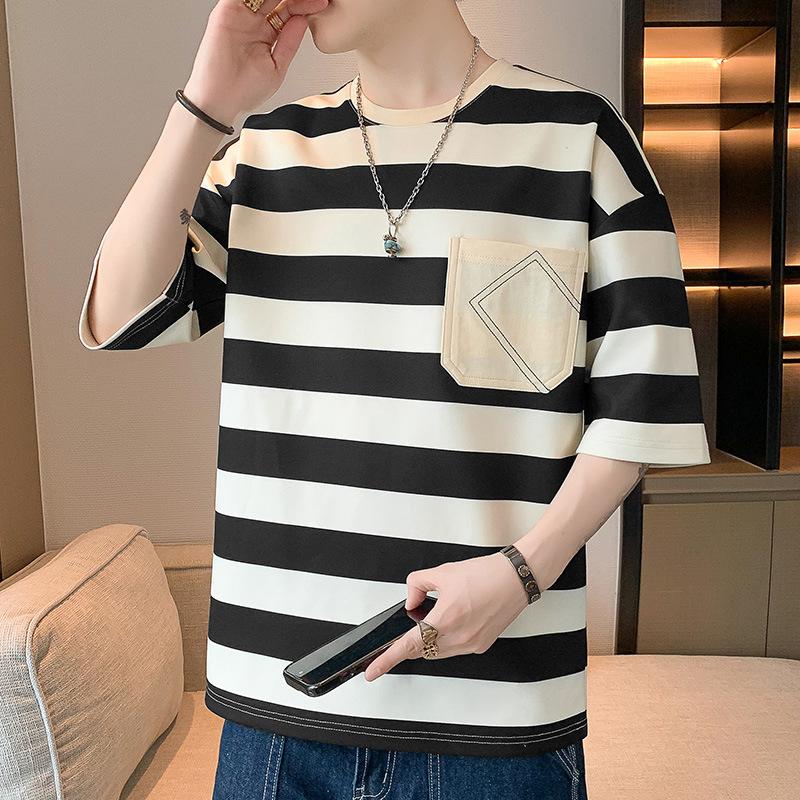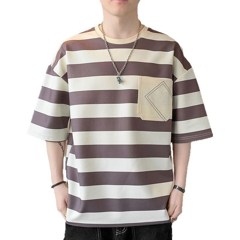Летняя мужская свободная футболка с короткими рукавами, полосатый топ, круглый вырез, футболка с короткими рукавами