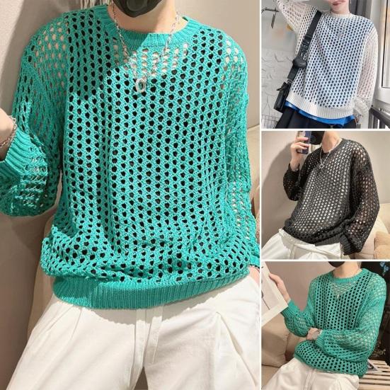 Мужской полый топ в сетку, однотонный, с круглым вырезом, свободный, с длинными рукавами, клубная одежда, прозрачный эластичный пуловер в стиле хип-хоп, вечерние топ