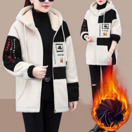 Женская осенне-зимняя куртка с капюшоном и цветными блоками, толстый плюшевый кардиган с длинным рукавом и вышивкой букв, на шнурке, мягкая уютная молния, Cosure, кардиган, женское пальто средней длины