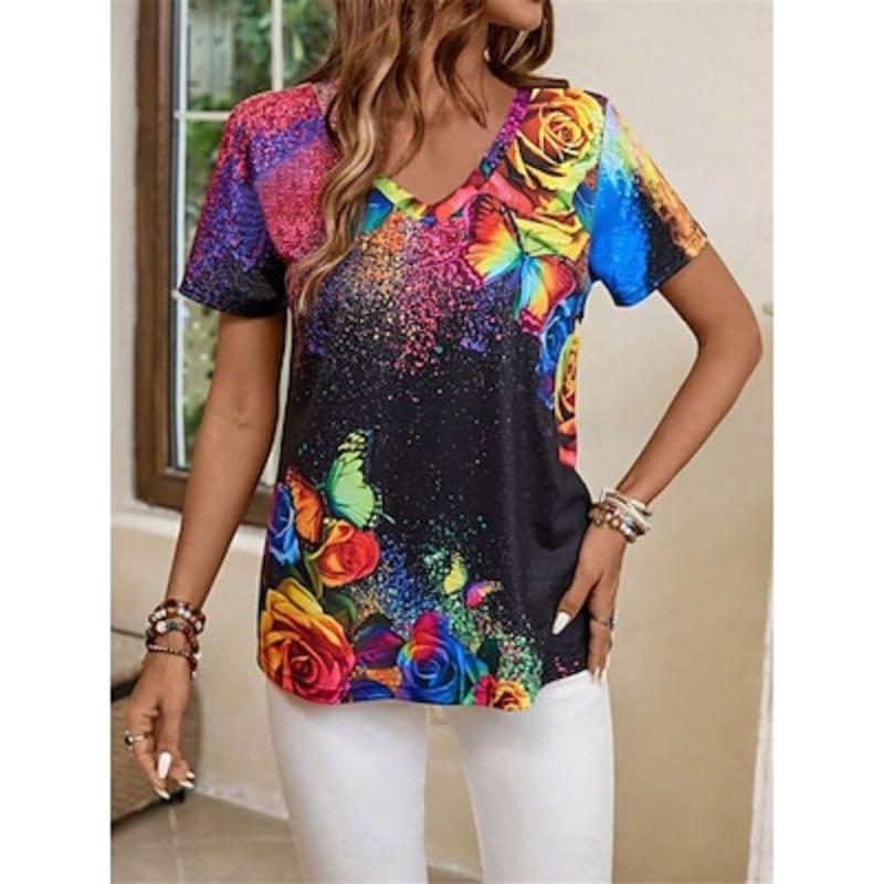 Женская футболка стильная повседневная с принтом короткий рукав обычные топы V-образный вырез повседневный синий летний