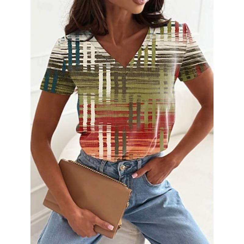 Женская футболка с графическим геометрическим узором, повседневная, с коротким рукавом, с V-образным вырезом, обычные топы, повседневный принт, розовый, синий, зеленый, лето, весна