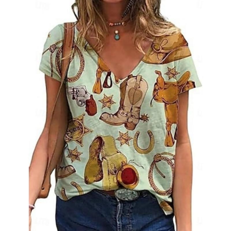 Женская блузка с графическим принтом Bohemia Vintage Western с коротким рукавом V-образным вырезом, обычные топы с принтом, повседневные, синего, коричневого, зеленого, абрикосового цвета, лето