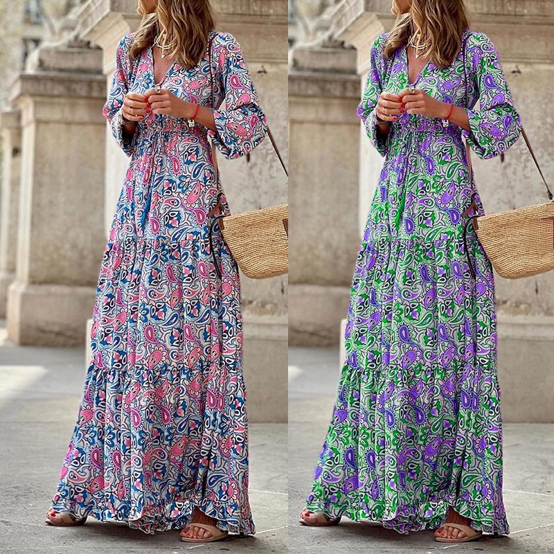 Женское весеннее модное платье в стиле бохо с V-образным вырезом и длинными рукавами средней длины — купить товар онлайн с бесплатной доставкой по всему миру!