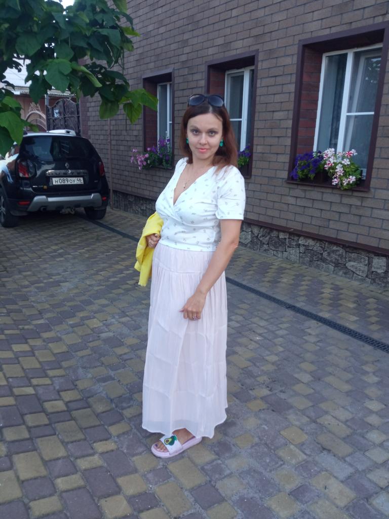 Юбочка для лета просто красота, без всяких наворотов, сама ткань уже украшение. Сшита исключительно аккуратно, подойдёт для любого случая. На мой рост 167 чуть выше щиколотки, а в талии она конечно растягивается до 95, но на мою в 90см очень туго, прямо впивается. Надо что то придумать, переделать пояс. Только подобрать такого цвета ткань. А в бедрах 110 как раз. Вот как то так. Подъюбник в тон, чуть короче самой юбочки, не просвечивает.