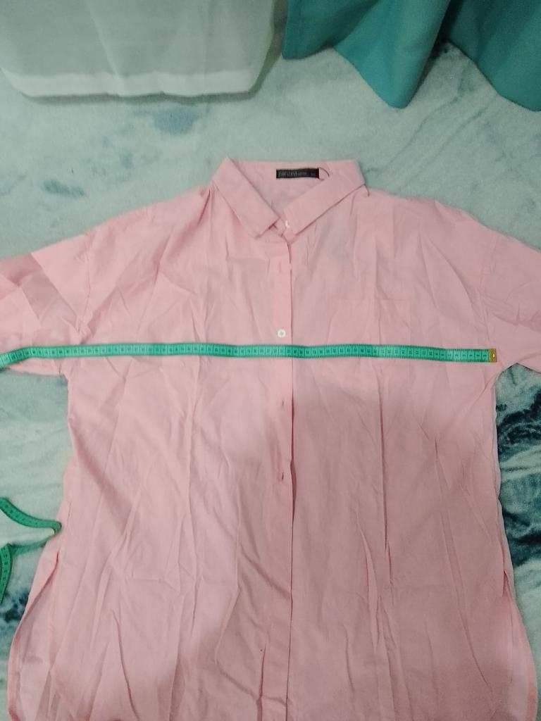 Рубашка голубого цвета. Размер подошёл. Размеры по груди по рубашке 128 см. Размеры внизу, где спинка и перед расходятся 132 см. Мой рост 164 см. Одела. Рукава длинные. Загнула на длину манжеты. Теперь хорошо. На груди сошлось. Даже свободно. Мой объём груди 120 см. Руки опустила вдоль туловища и кончиками пальцев достала подола рубашки. Такова длина изделия. Хлопок. К телу приятно.