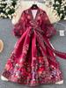 Великолепное шифоновое платье с цветочным принтом и рукавами-фонариками, бандажное платье со шнуровкой и запахом, женское платье с крестообразным V-образным вырезом, плотная атласная одежда для вечеринок в стиле бохо