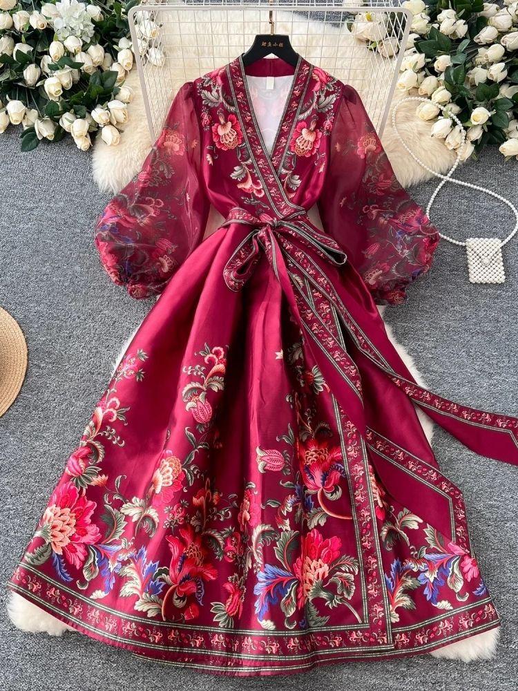 Великолепное шифоновое платье с цветочным принтом и рукавами-фонариками, бандажное платье со шнуровкой и запахом, женское платье с крестообразным V-образным вырезом, плотная атласная одежда для вечеринок в стиле бохо — купить товар онлайн с бесплатной доставкой по всему миру!