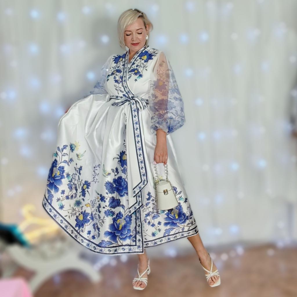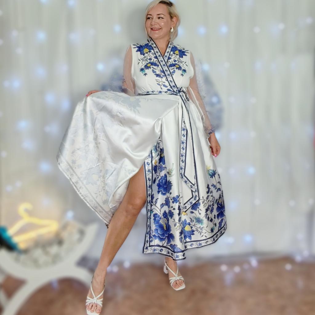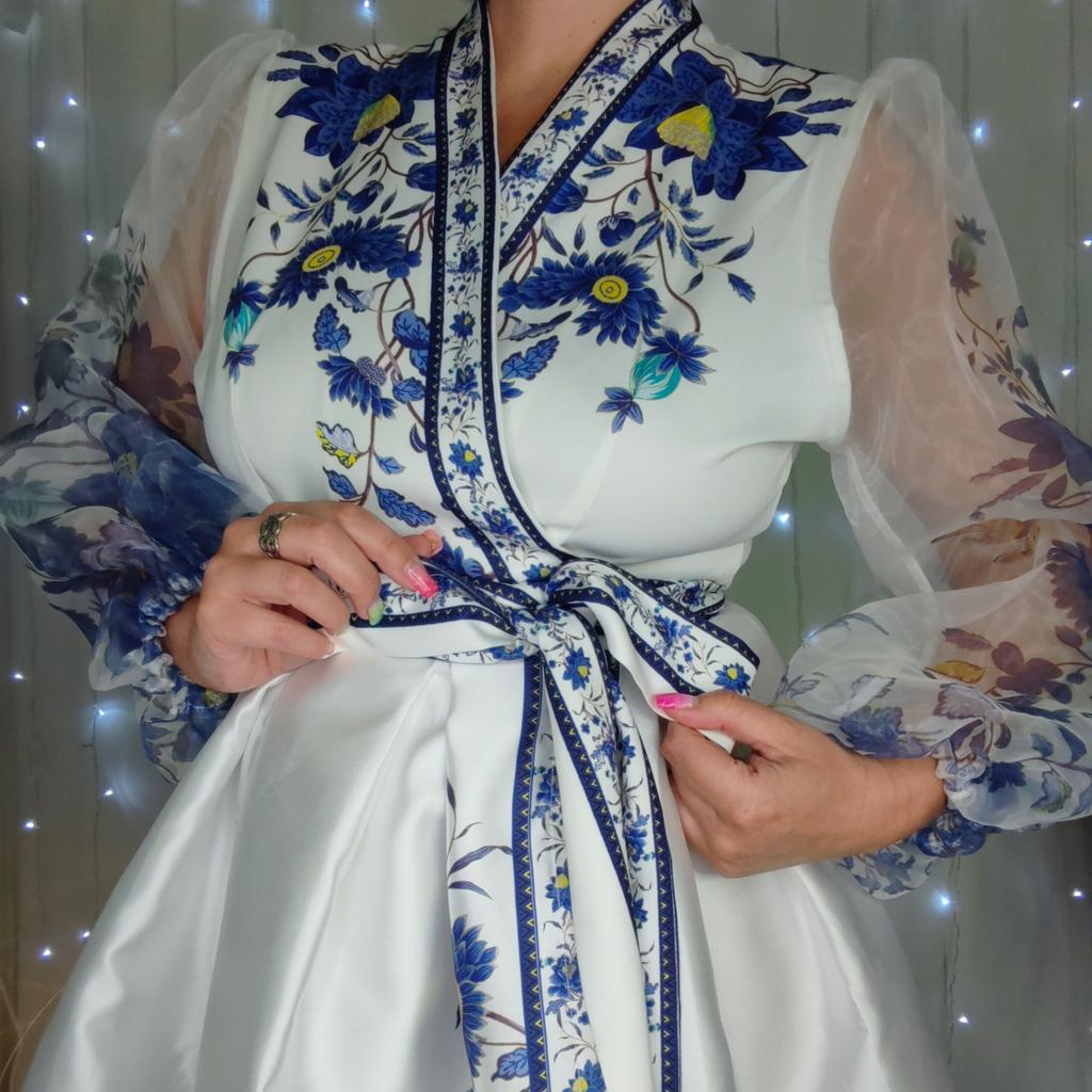 Сказочное платье 😍 Это что то на языке "Wow"! Невероятное платье! Очень красивое и очень удобное! Словно сошло с подиумов! И скажу словами Ренаты Литвиновой: "Таким просто приятно обладать, не обязательно носить" 😍 ‼️Добавила разговорное видео посмотрите перед покупкой там больше деталей ‼️ Ткань : Сшито платье из трех видов ткани : Основная ткань (юбка) это плотный атлас. Хорошо держит форму и не тянется. На груди и по спинке ткань мягче и без блеска. Думаю это разновидность синтетики и она не тянется и не просвечивает. На рукава шифон, но он "пушистый" держит форму при этом не колется. Дизайн : Платье выполнено на запах. Причём ткани много и это говорит о том, что платье сядет практически на любую фигуру. Пояс очень длинный и можно вокруг талии раз 10 обернуть 😅. Рукава имеют резиночку на конце. Расцветка это просто отдельный вид искусства, её хочется разглядывать, очень - очень красиво! Размер: На мне 3XL Мои параметры : рост 172 см 98/76/106 см Детали : Длина 133 см Плечи 40 см Длина рукава 62 см ОГ до 110 см ОТ до 105 см Резюмирую: Это платье подойдёт на выход, где надо произвести фурор. К этому платью надо иметь ещё и характер, потому что все будут обращать на Вас внимание! Это платье невероятно удобное не смотря на всю его визуальную сложность. На мой взгляд особенно хорошо оно будет смотреться на высоких девушках или девушках с формами! Рекомендую 👍 Я не прощаюсь, M_K #невероятное