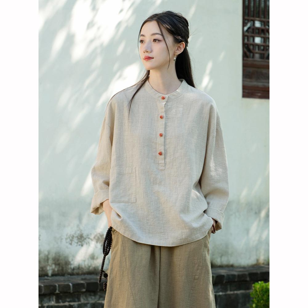 Женская рубашка из хлопка и льна в китайском стиле с воротником-стойкой и пуговицами, с длинными рукавами, футболка