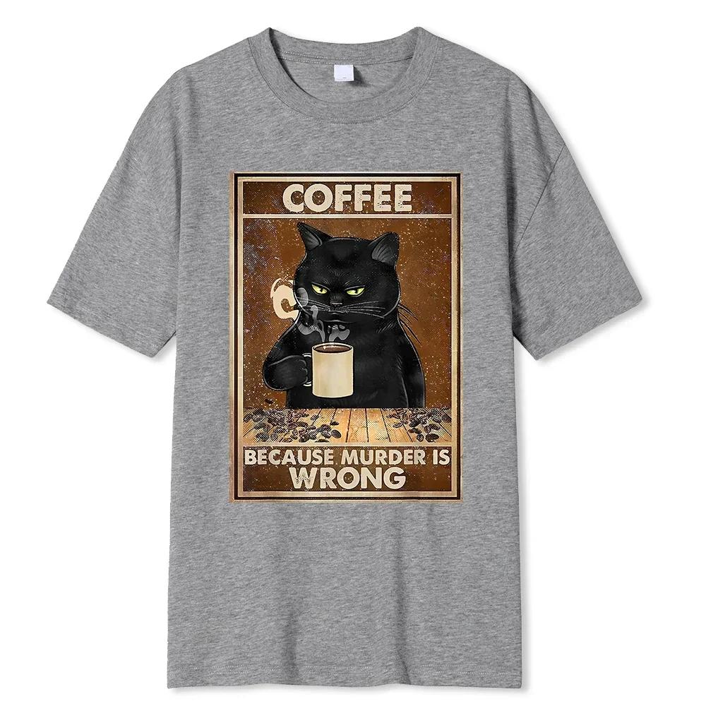 Новые модели Кофе, потому что убийство - это неправильно Черная кошка пьет кофе Модная смешная футболка Тренд Шарм Хлопковые топы Короткие рукава