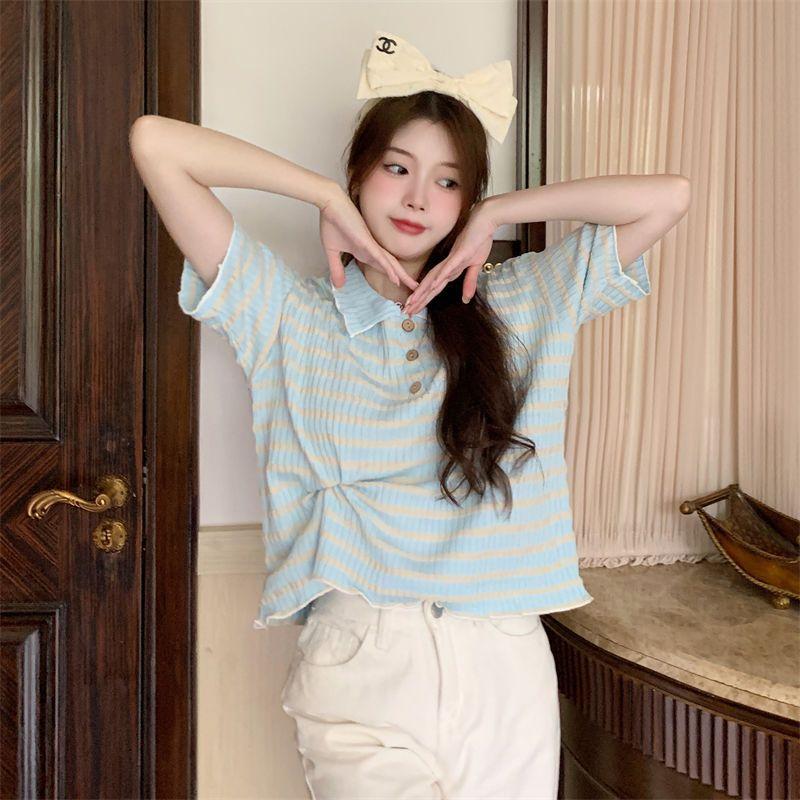 Летняя футболка с открытыми плечами, женская трикотажная футболка с воротником-поло, милый дизайн с короткими рукавами — купить товар онлайн с бесплатной доставкой по всему миру!