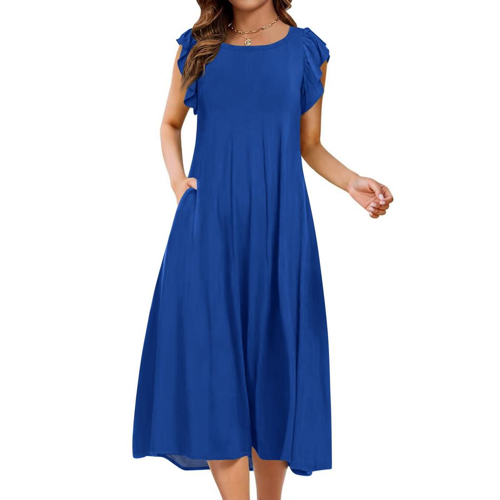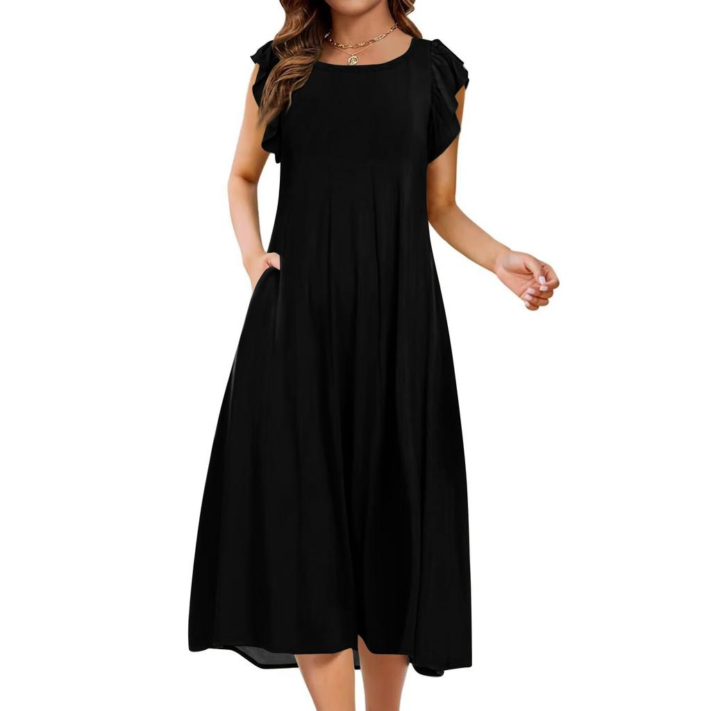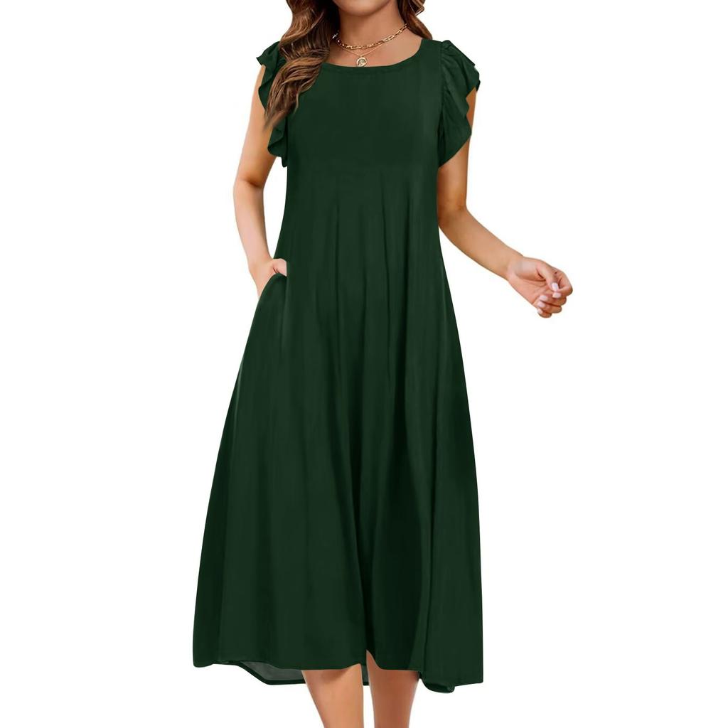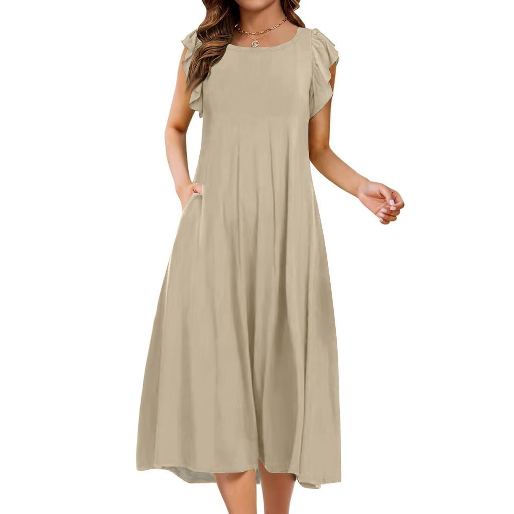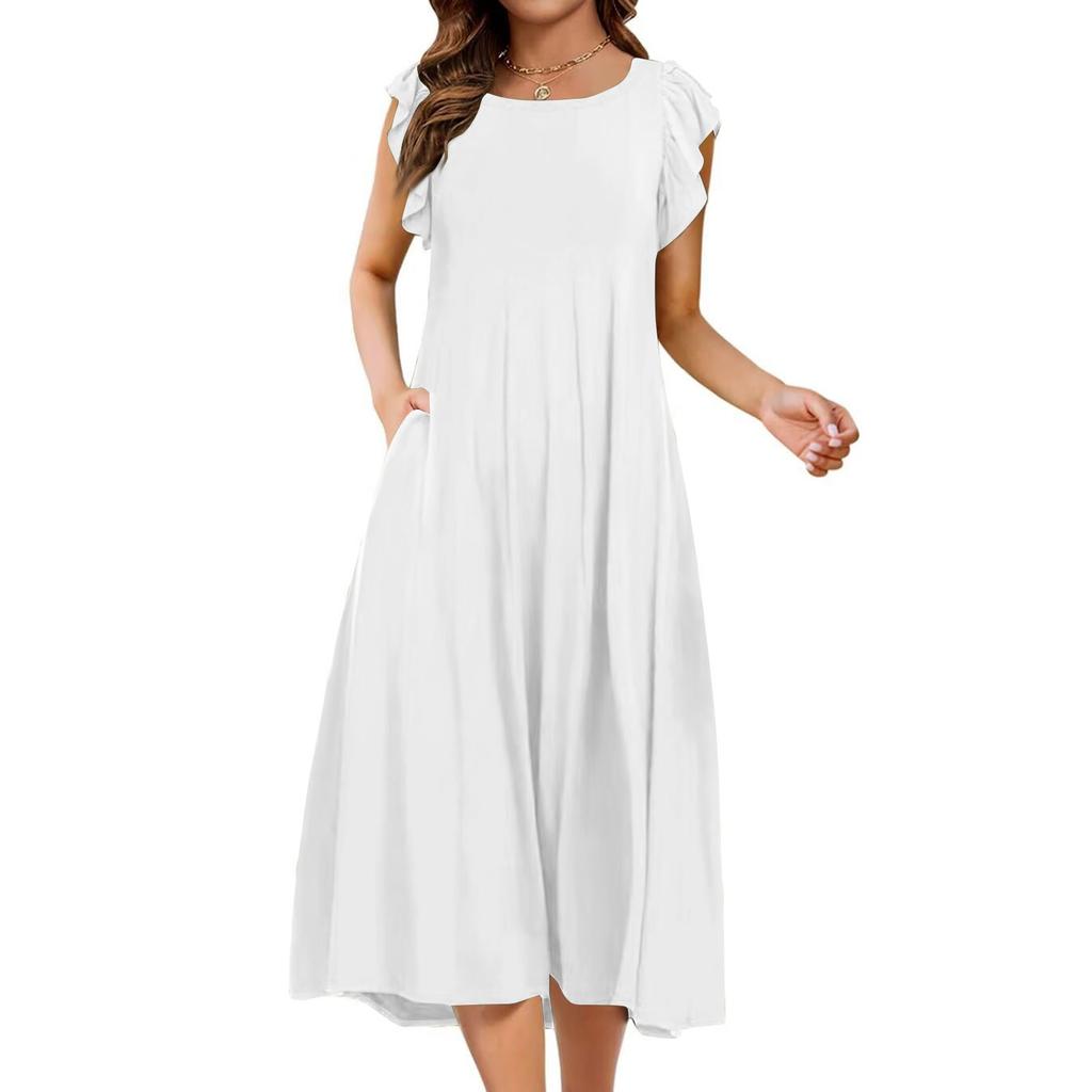 Женское цельное платье с короткими рукавами, расклешенными рукавами, свободное повседневное платье с круглым вырезом
