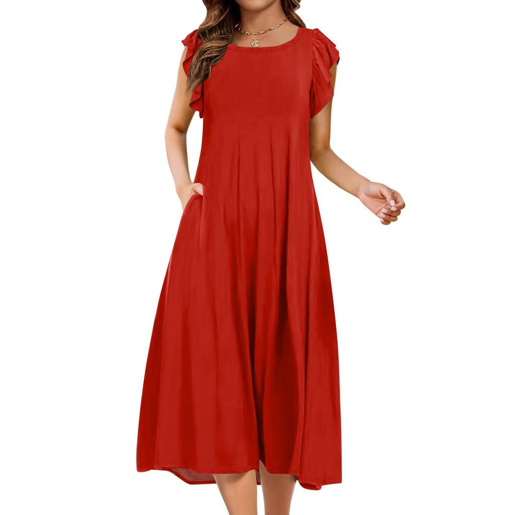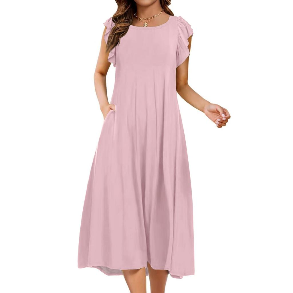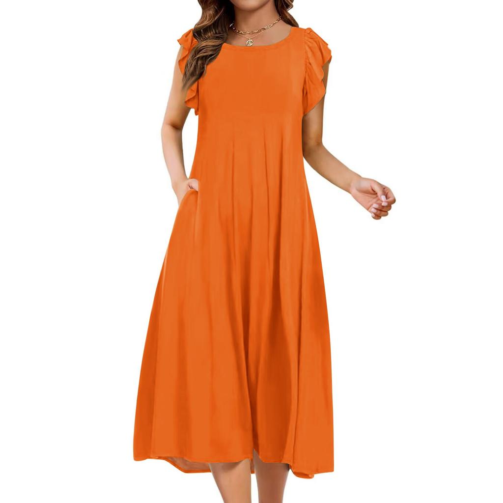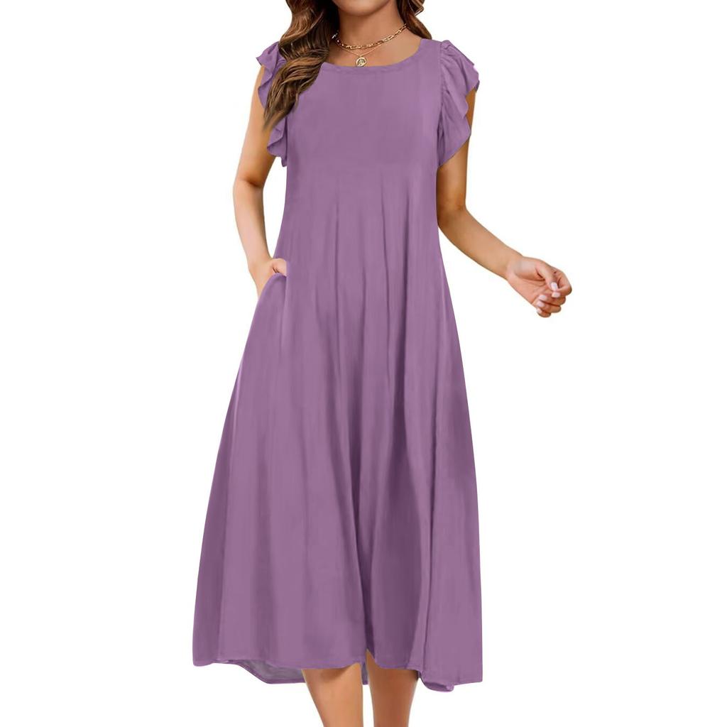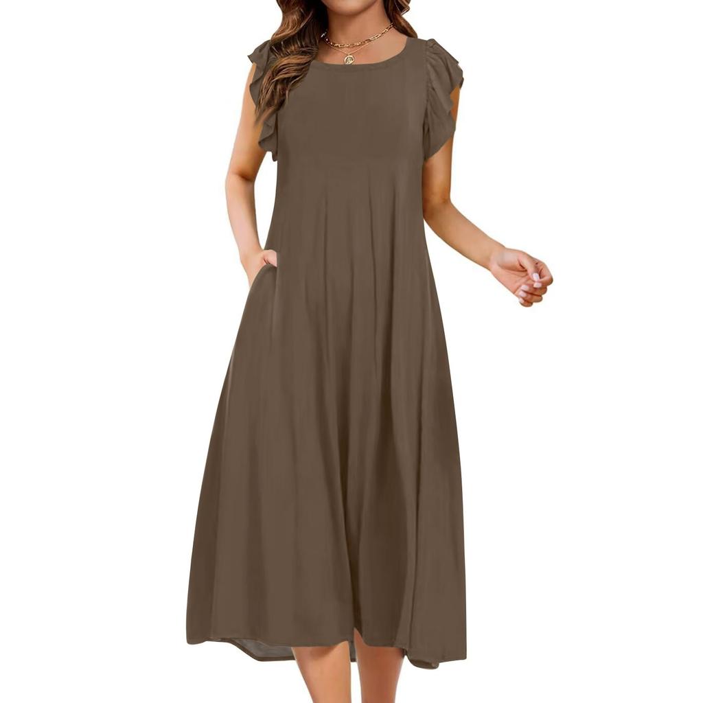 Женское цельное платье с короткими рукавами, расклешенными рукавами, свободное повседневное платье с круглым вырезом