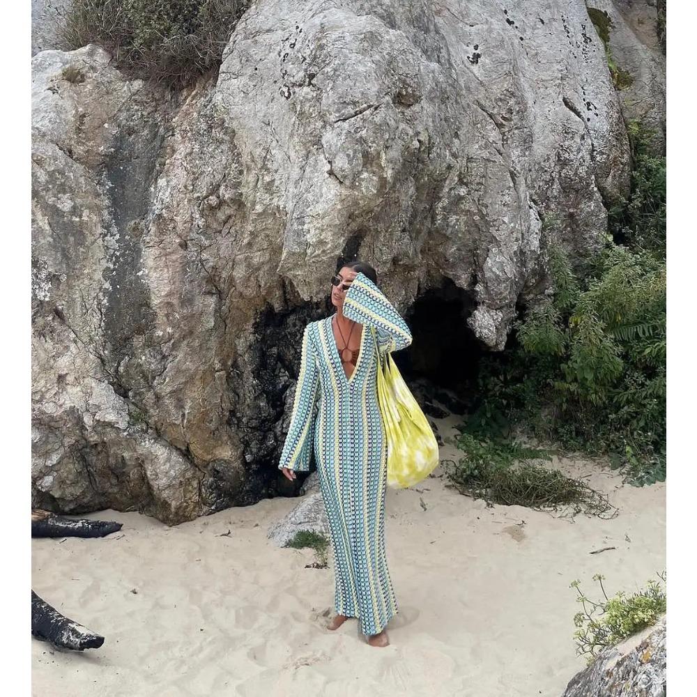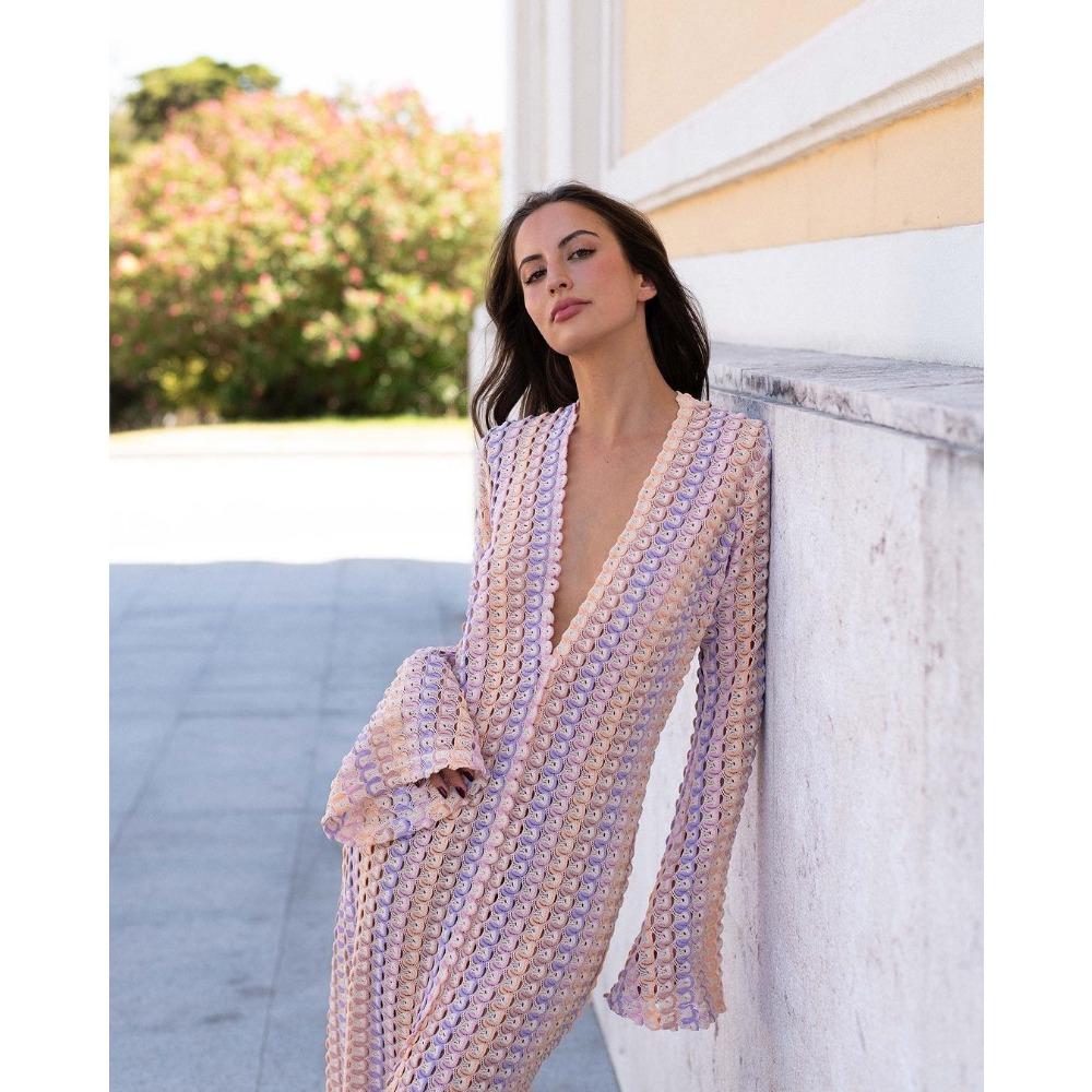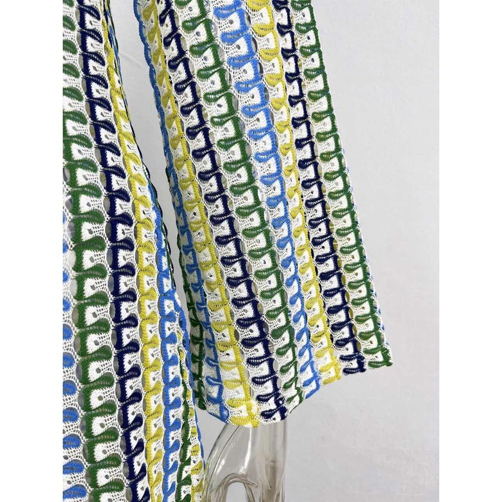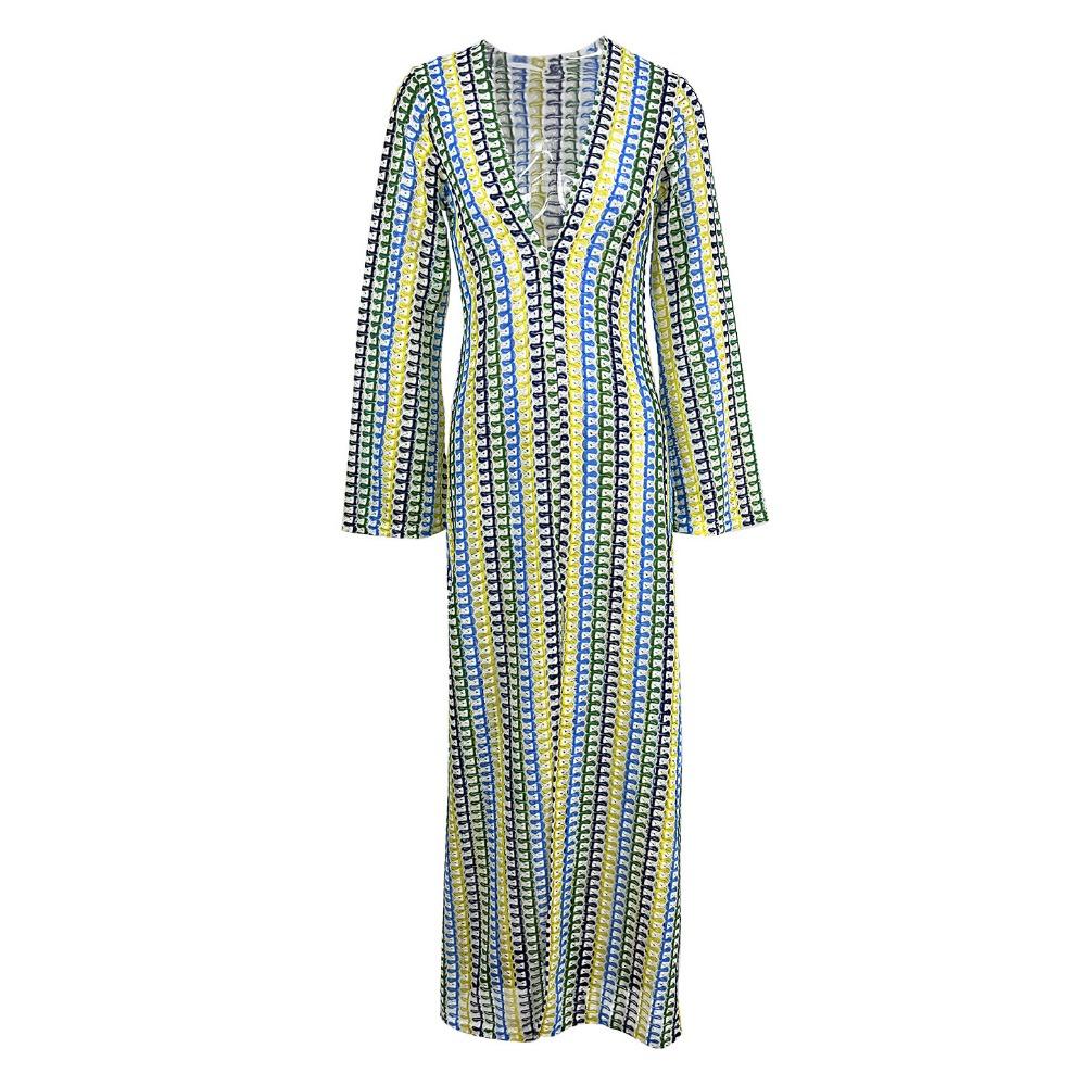 Вязаное крючком красочное полосатое макси-платье для женщин с расклешенными рукавами и V-образным вырезом, с высоким разрезом, сексуальное длинное платье для пляжа, банкета, платья