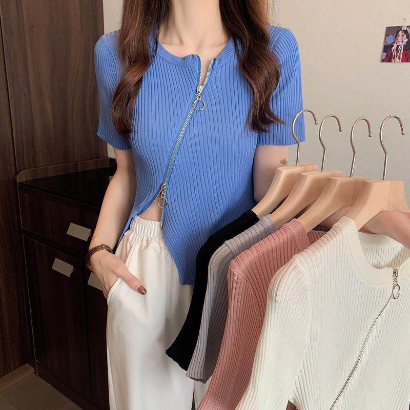 Летняя дизайнерская трикотажная футболка с короткими рукавами на молнии для женщин, тонкие и узкие короткие топы с высокой талией, повседневные, удобные, облегающие, свитера, футболки