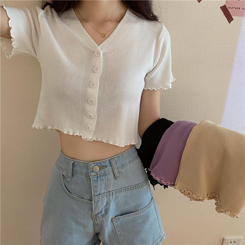 Модный универсальный модный короткий топ с V-образным вырезом, открывающий глаза, снаружи, тонкая часть трикотажного свитера с короткими рукавами, женский повседневный облегающий свитер, футболки