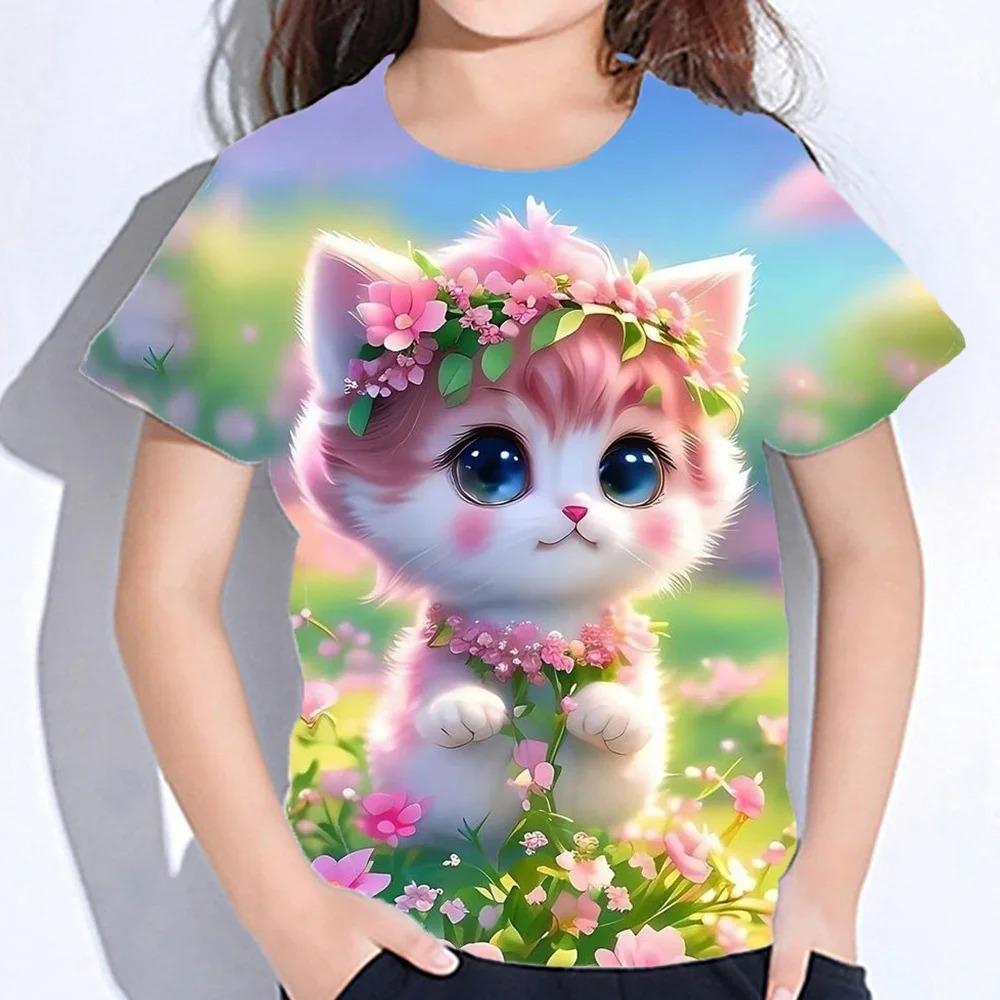 Летние детские топы с изображением милых котов, футболки с 3D-цветочным принтом, детская одежда с коротким рукавом и круглым вырезом для девочек, повседневная одежда