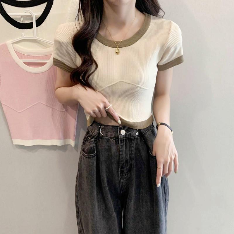 Футболка Color Clash с короткими рукавами, трикотажные короткие женские простые летние топы Sense Niche, повседневные, удобные и стильные, облегающие свитера, футболки