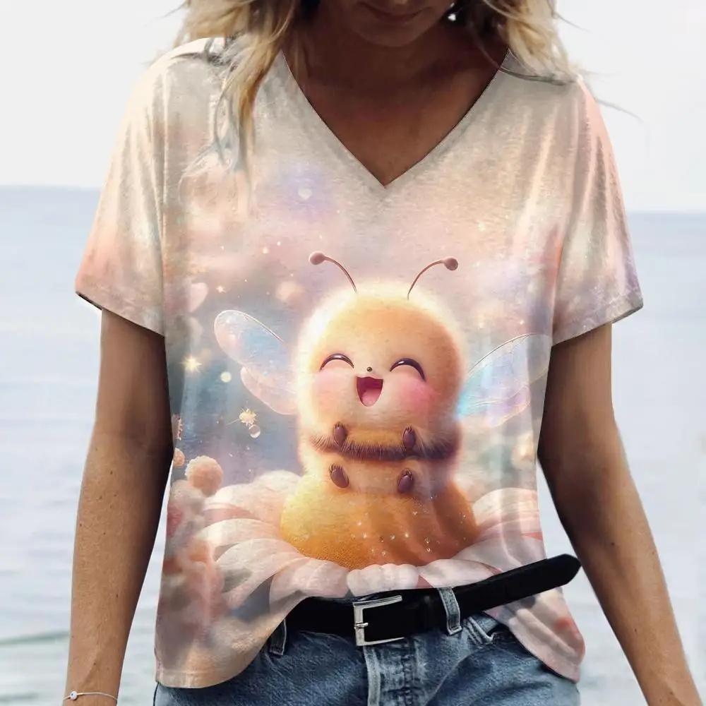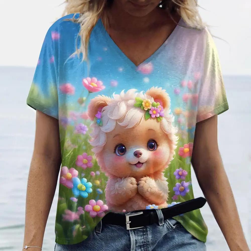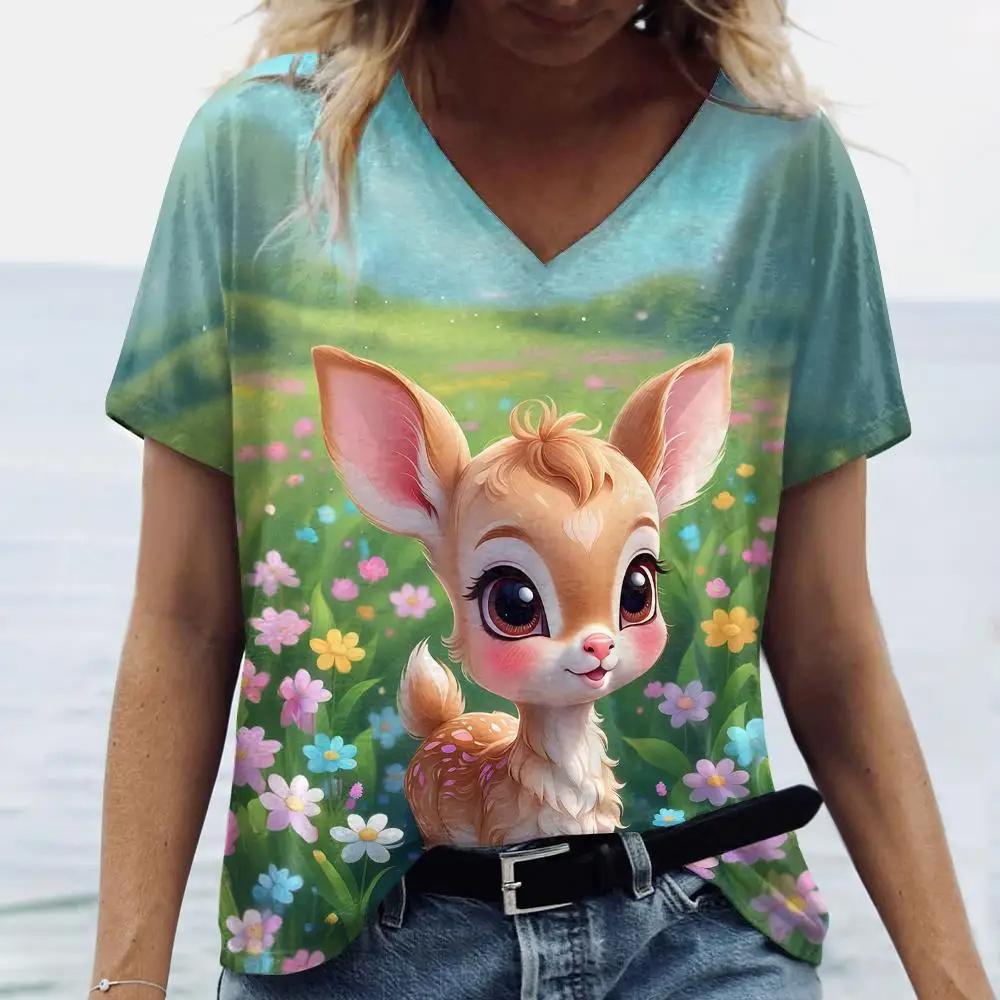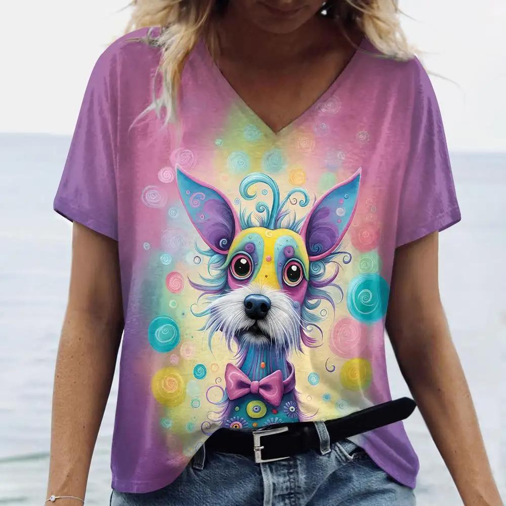 Летняя женская модная футболка с рисунком собаки из мультфильма, топы с V-образным вырезом, футболки, повседневная одежда с коротким рукавом, стильная женская одежда