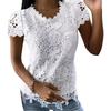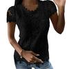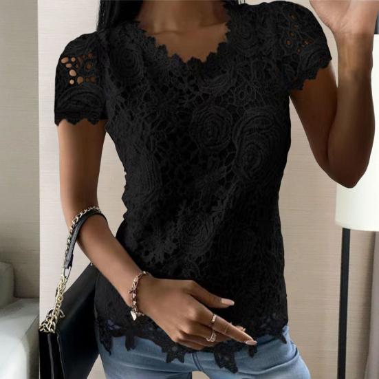 Элегантное кружевное сращивание: Подчеркните свой стиль с помощью этой однотонной женской рубашки с короткими рукавами, украшенной замысловатыми кружевными вставками на рукавах, которая легко добавит вашему образу нотку изысканности.