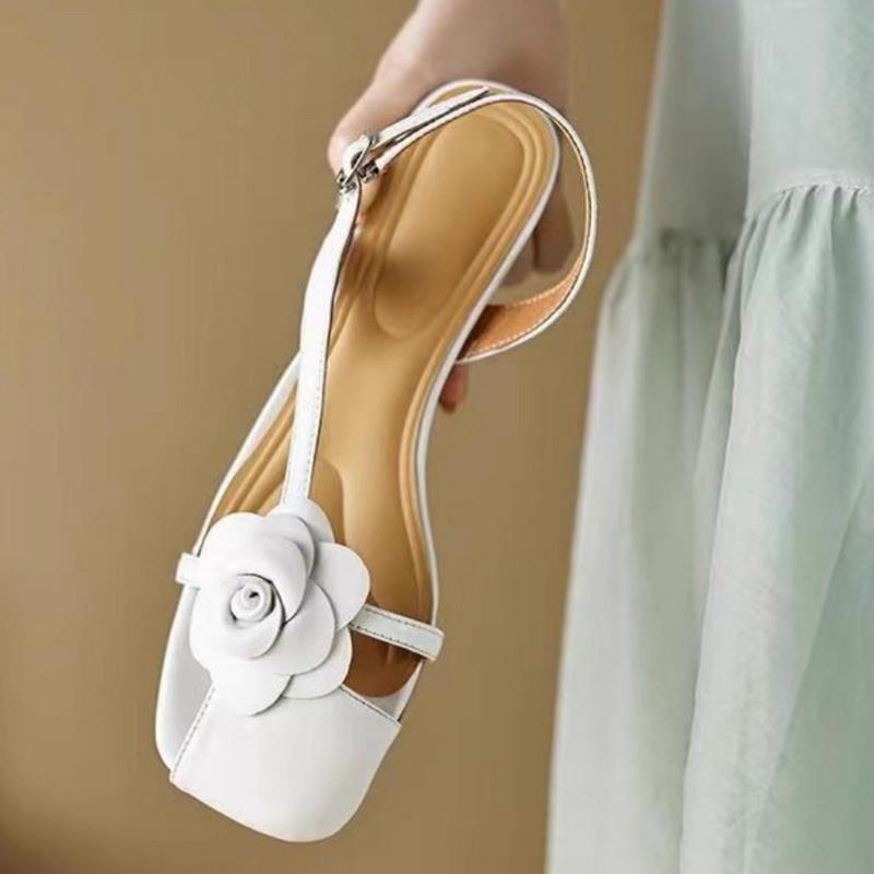 Новые дизайнерские летние женские сандалии с полузакрытым носком из натуральной кожи с квадратным носком и цветочной пряжкой на ремешке с пустым задником на среднем каблуке