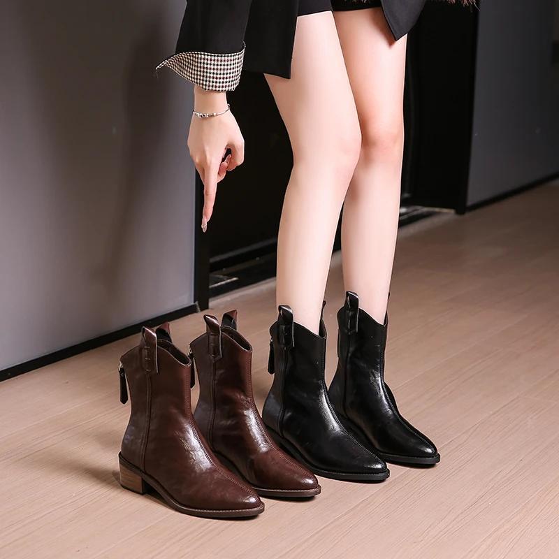 Французские кожаные короткие остроносые ботинки в стиле вестерн, женские туфли на среднем каблуке, облегающие, черные/коричневые, с застежкой-молнией сзади, размер 43 — купить товар онлайн с бесплатной доставкой по всему миру!