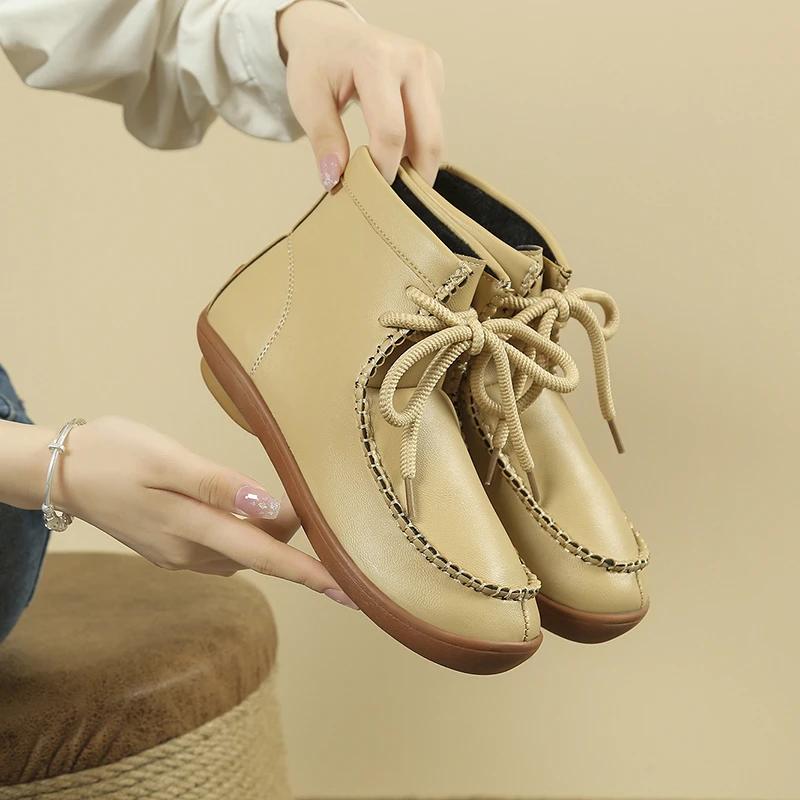Ботильоны в стиле ретро однотонные женские повседневные туфли с круглым носком на шнуровке из мягкой кожи на мягкой подошве, удобные лодки с подошвой из коровьей кожи