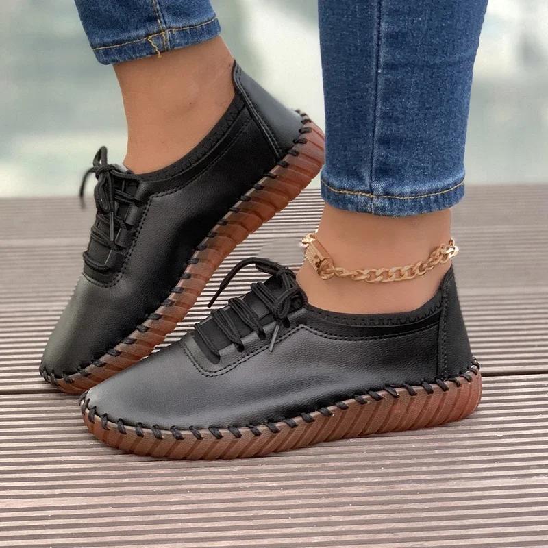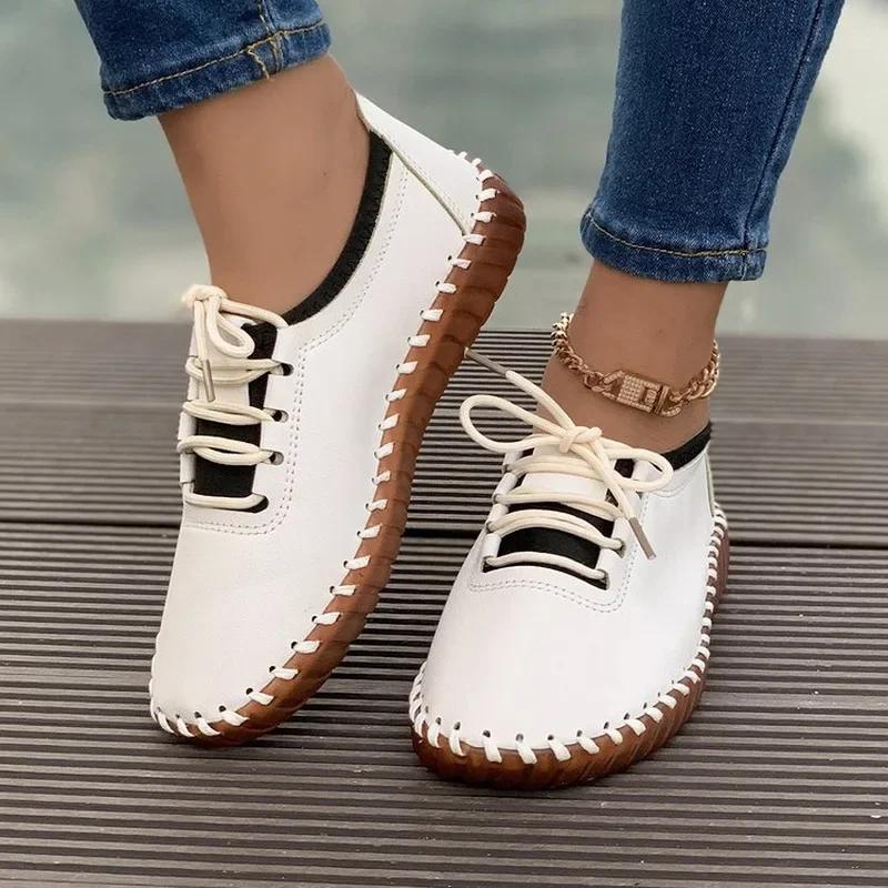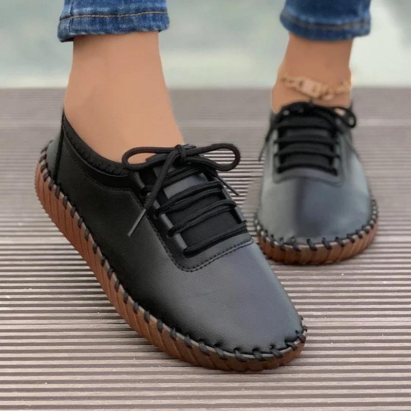 Женские лоферы на плоской подошве со шнуровкой, ручная работа, кожаные туфли 2025 года, повседневные сшитые оксфорды для мам, обувь Zapatos Mujer