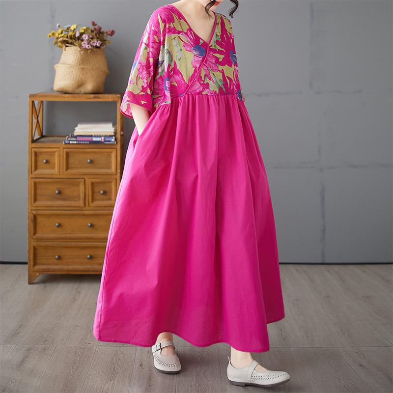 DIMANAF 2025 Летнее женское базовое платье большого размера Винтажный цветочный принт Повседневное свободное с V-образным вырезом Длинное платье макси — купить товар онлайн с бесплатной доставкой по всему миру!