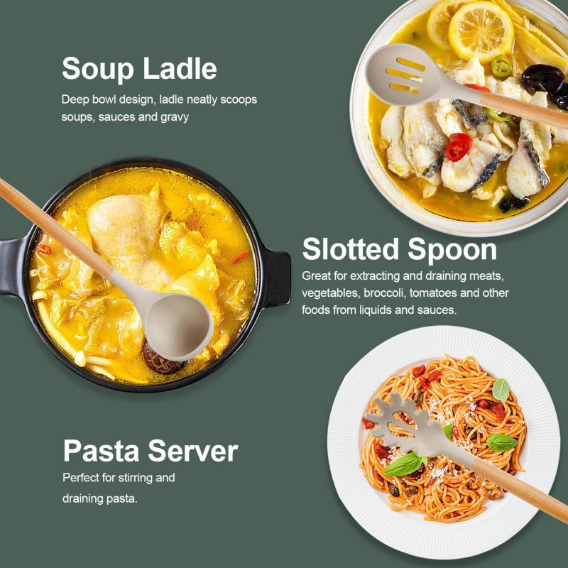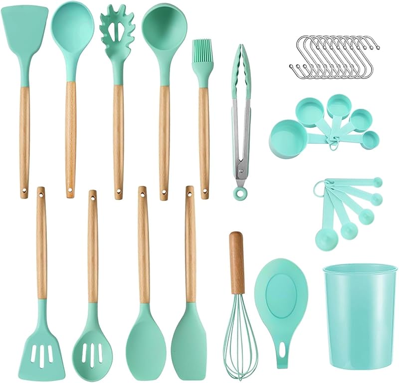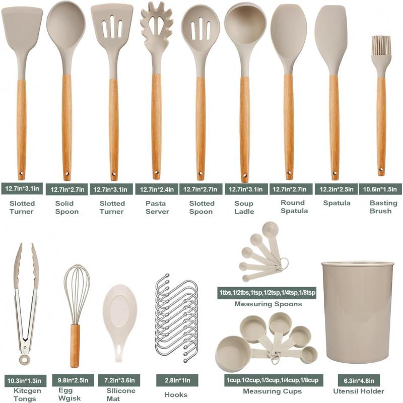 Набор кухонных принадлежностей - набор из 33 предметов из силикона с антипригарным покрытием и деревянной ручкой, кисточка для смазывания, венчик для взбивания яиц, щипцы.
