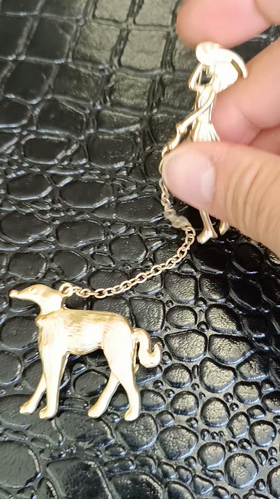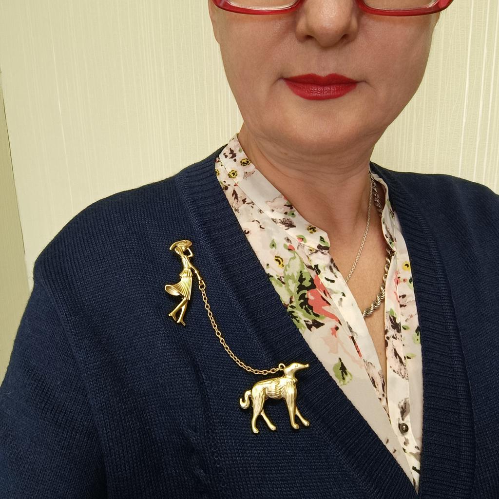 Брошка прекрасная. Превзошла все ожидания. Матовое золото. Не для блузок, но не тяжёлая. Хорошие застёжки и на девушке и на собачке. Высота девушки 5,5см, высота собачки 4,5см, длина цепочки 8см. Сделана очень аккуратно, много мелочей, например пальчики на лапках собаки. Спасибо продавцу и Джуму.