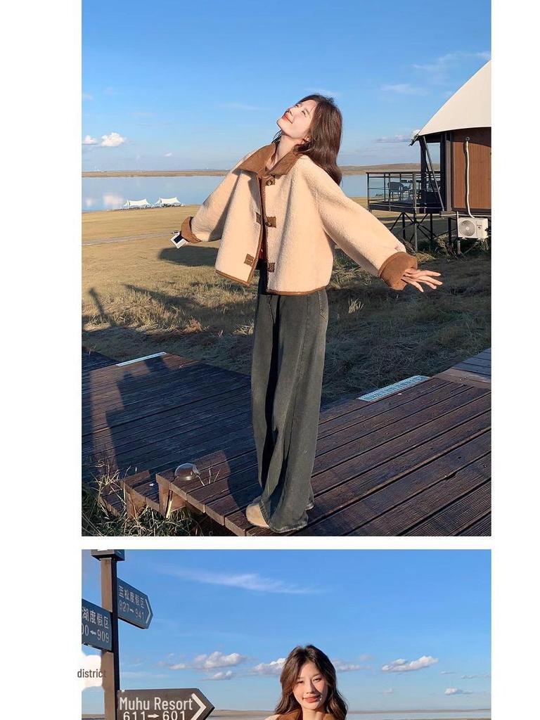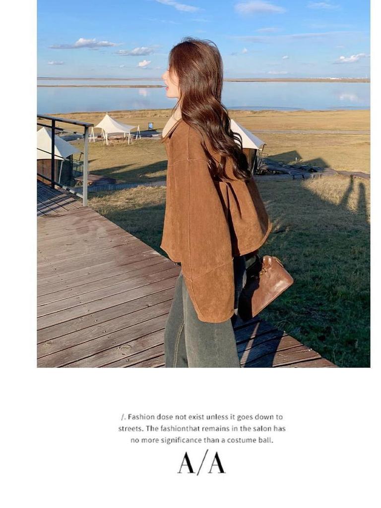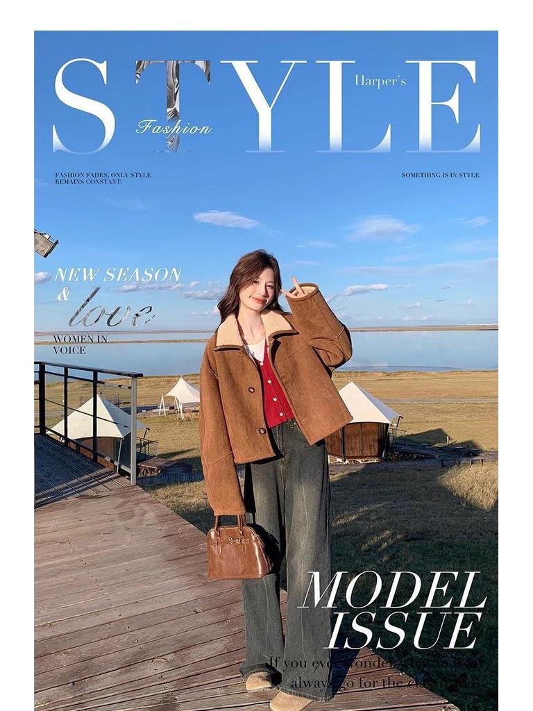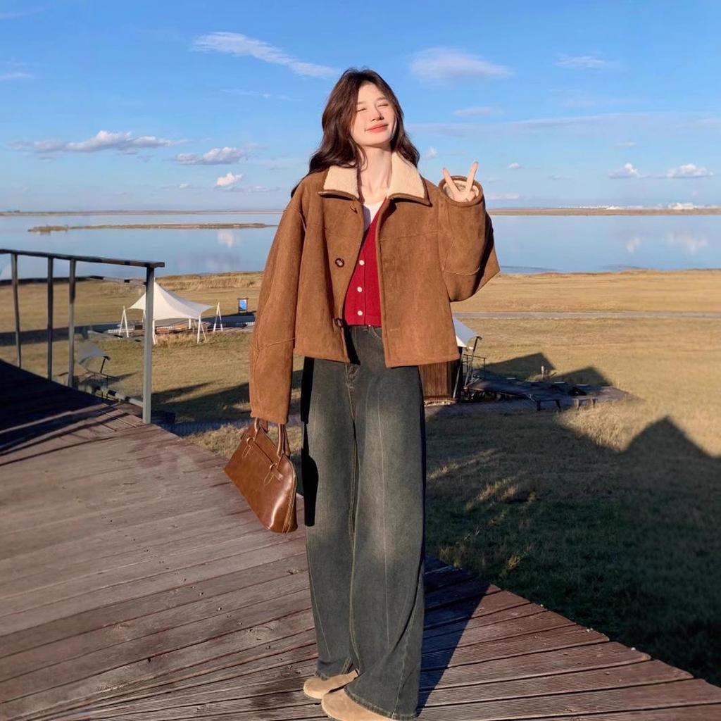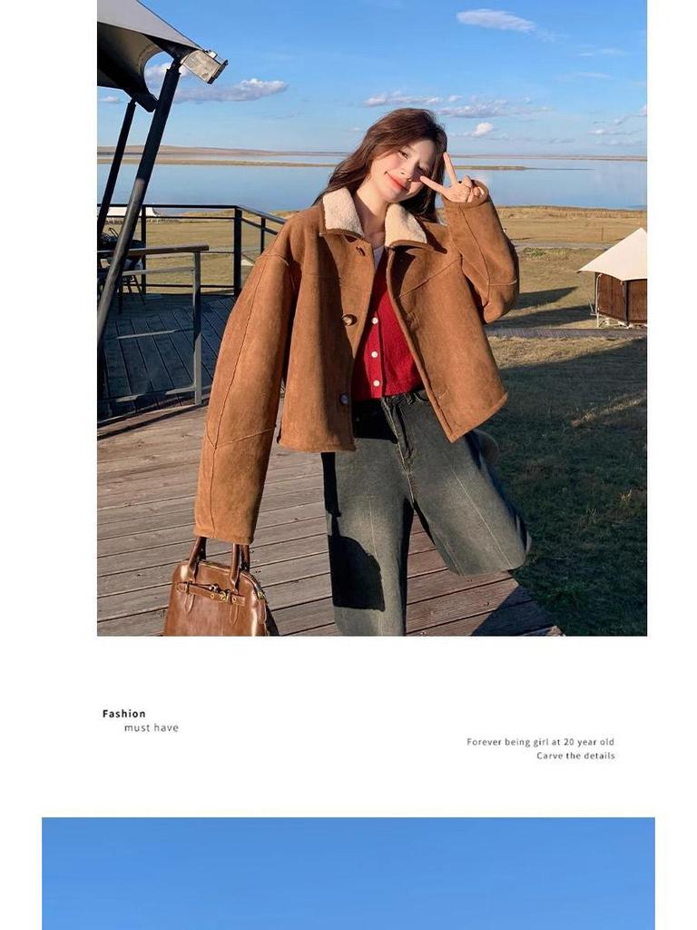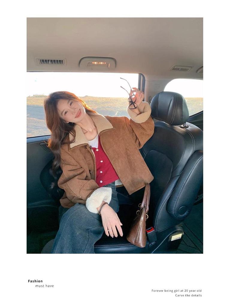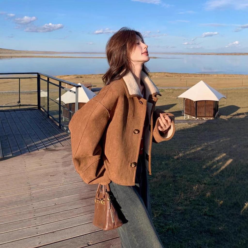 Женская двусторонняя шуба из овчины - маленькая, модная, из утолщенной замши.