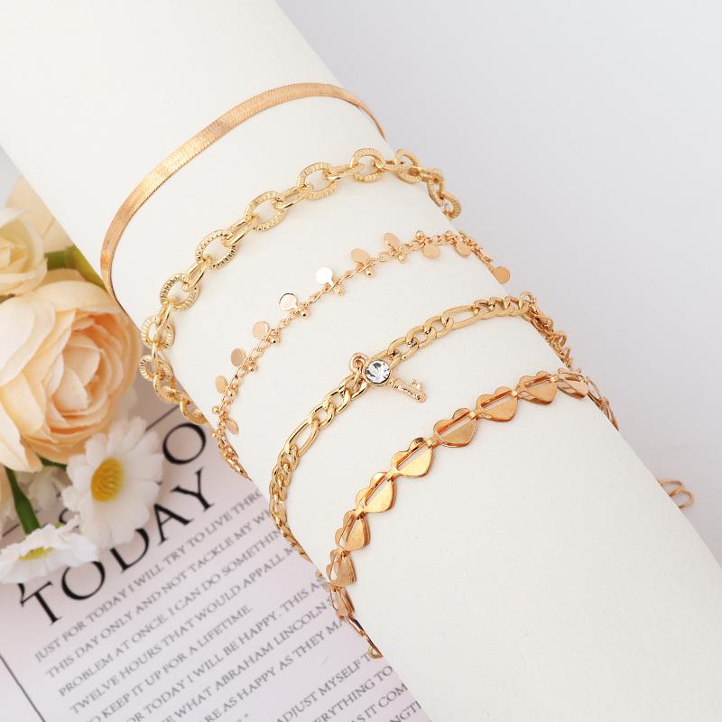 Набор браслетов на лодыжку в стиле панк с подвеской в виде сердца и ключа: Европейский и американский стиль, цепочка-змейка, кисточка, диск, бриллиантовые акценты - коллекция из 5 предметов