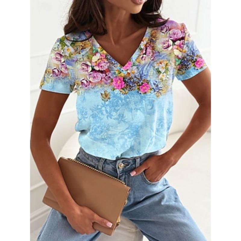 Женская футболка с цветочным принтом, повседневная, с коротким рукавом, с V-образным вырезом, обычные топы, повседневный принт, розовый, синий, зеленый, лето