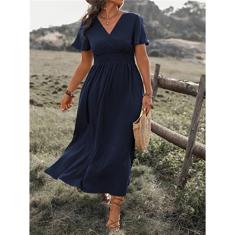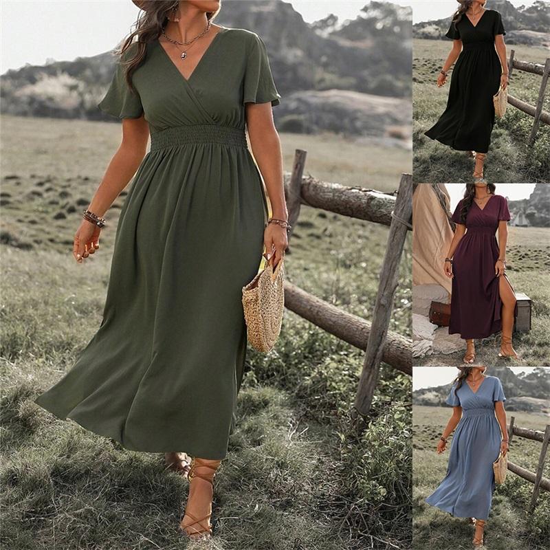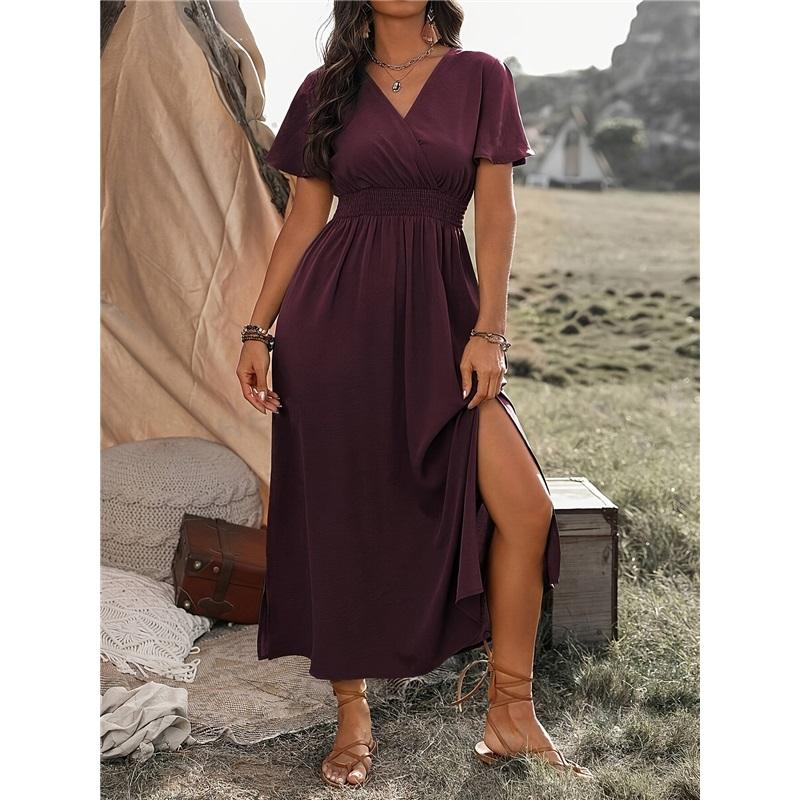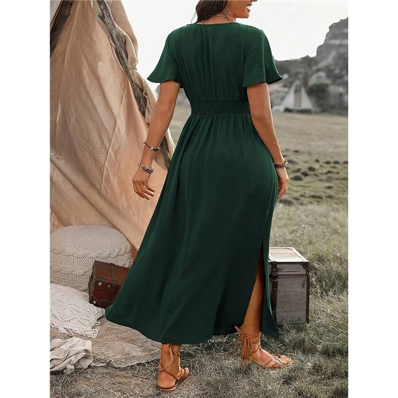 Однотонный V-образный вырез, расклешенные рукава, эластичный пояс, тонкая юбка с разрезом