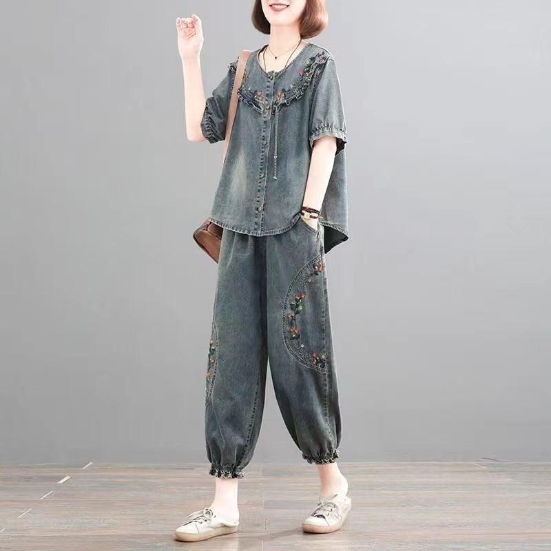 Джинсы, джинсовые комплекты, женская весна-лето, корейская свободная джинсовая рубашка + джинсовые брюки на резинке, 2 шт., большой размер, повседневный ретро-костюм