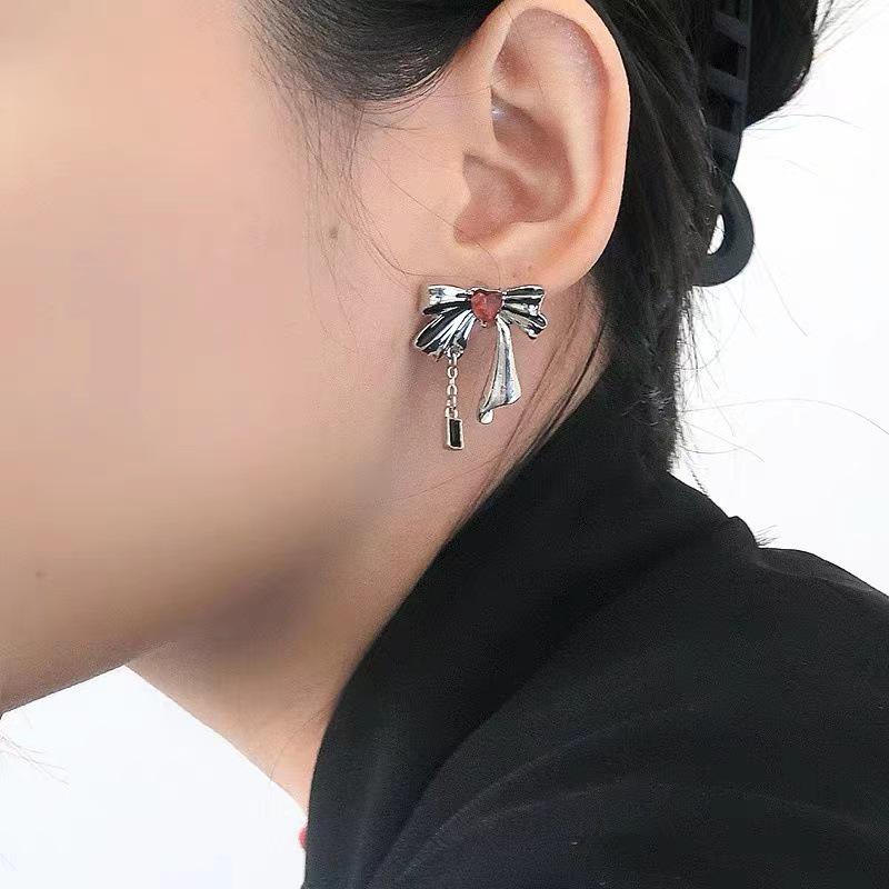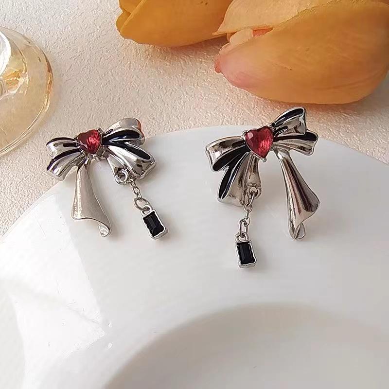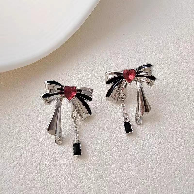 Серьги из серебра 925 пробы с красным сердцем и бантом для женщин