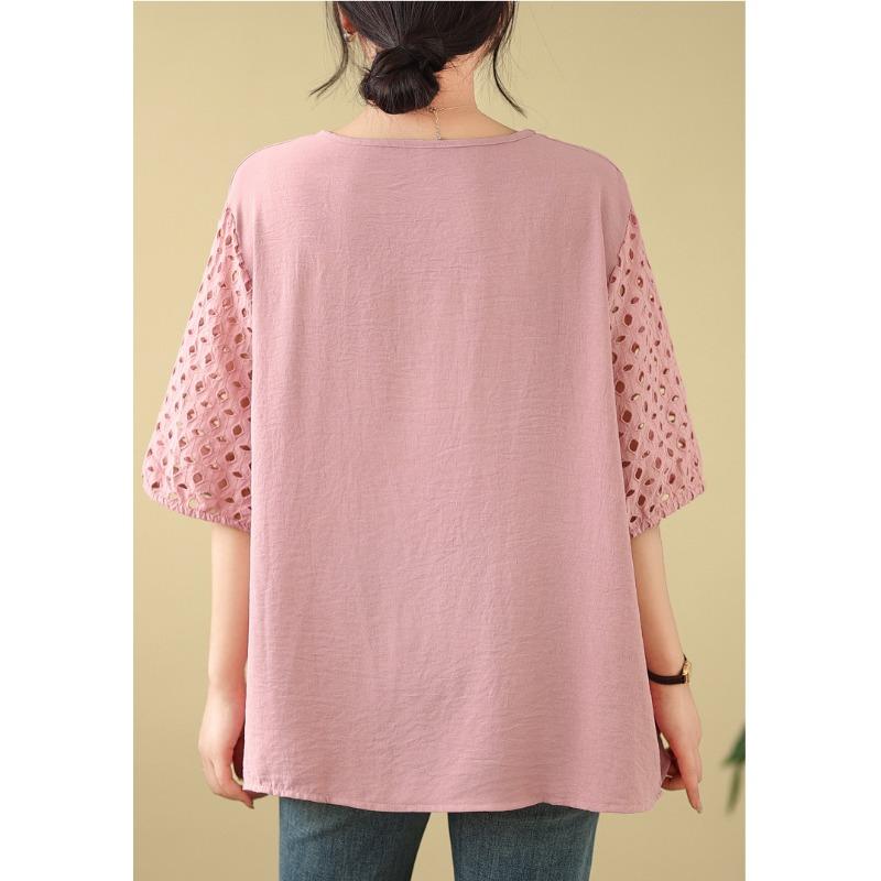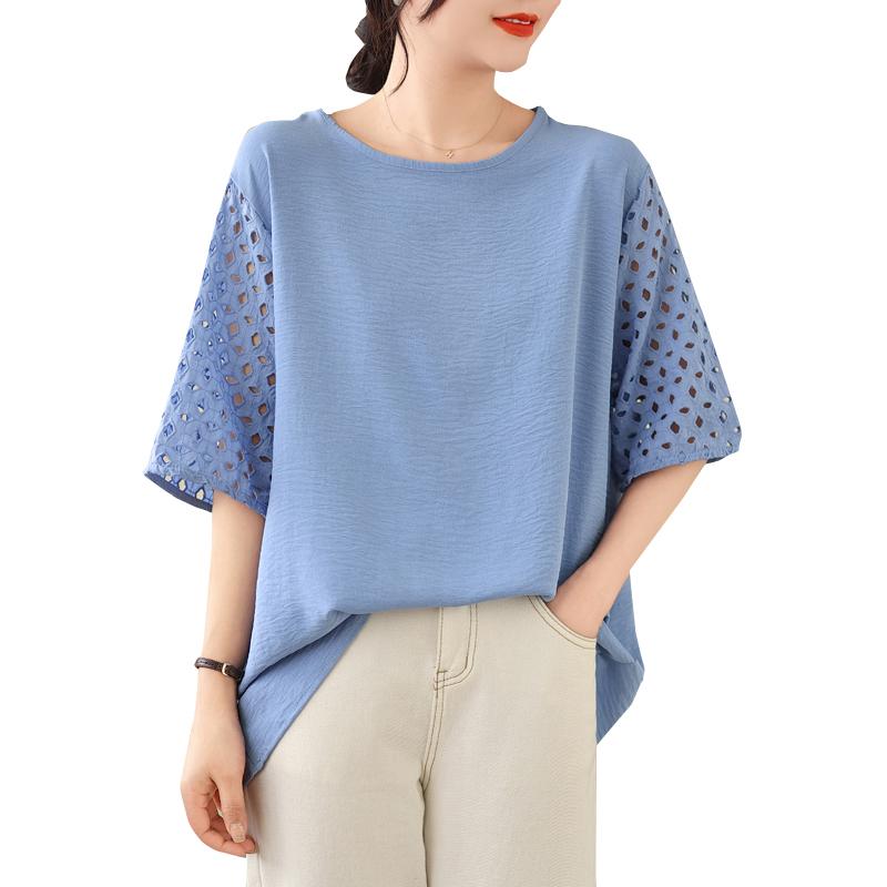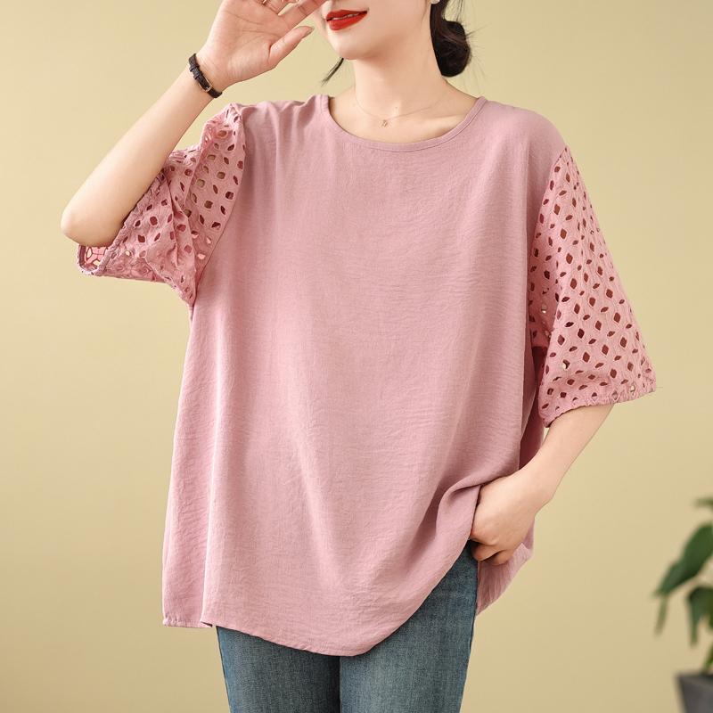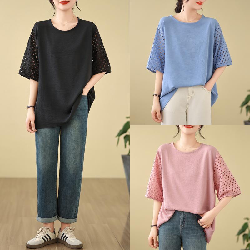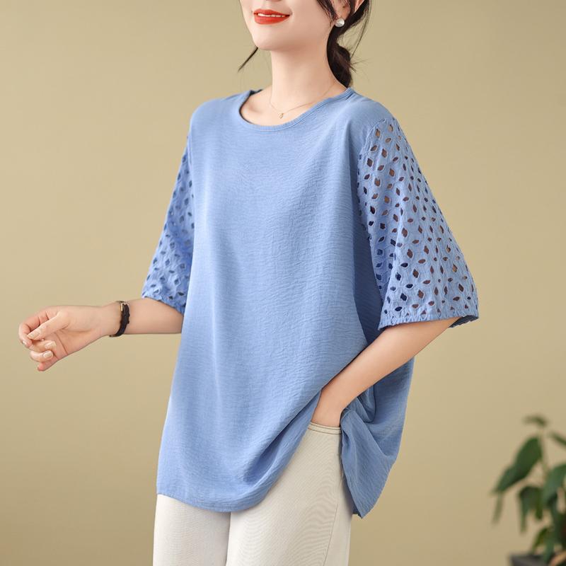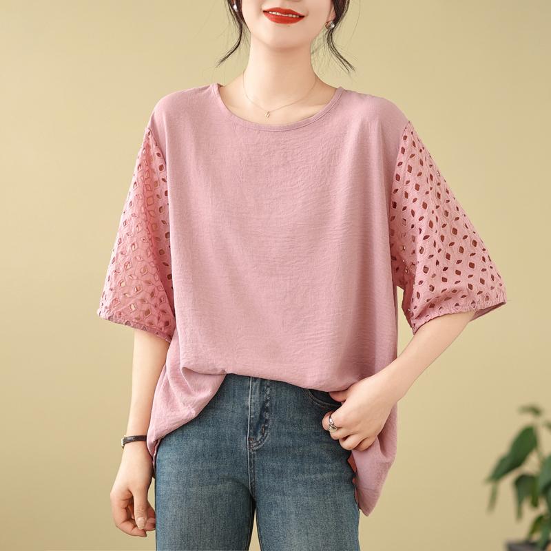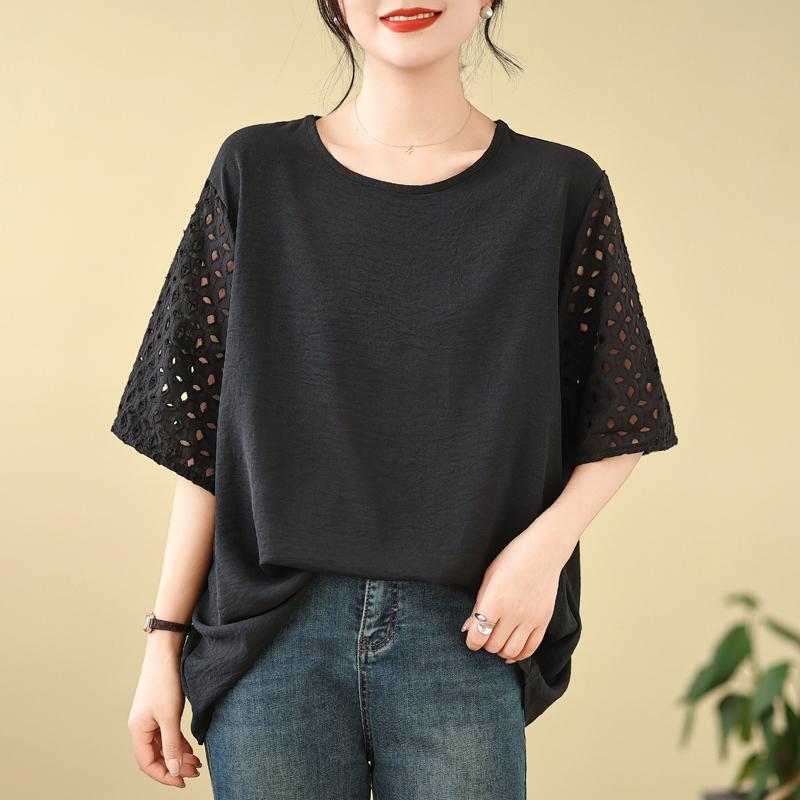 DIMANAF 2025 Новая Летняя Футболка Большого Размера Женская С Круглым Вырезом Повседневная Ажурная С Коротким Рукавом Свободные Топы Футболки Однотонная