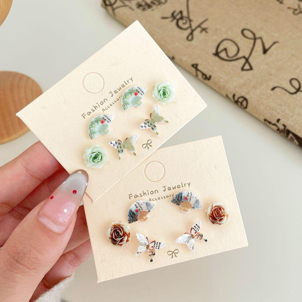 Elegant Chinese-style Butterfly & Fan Earrings Set with Resin Landscape Design — купить товар онлайн с бесплатной доставкой по всему миру!