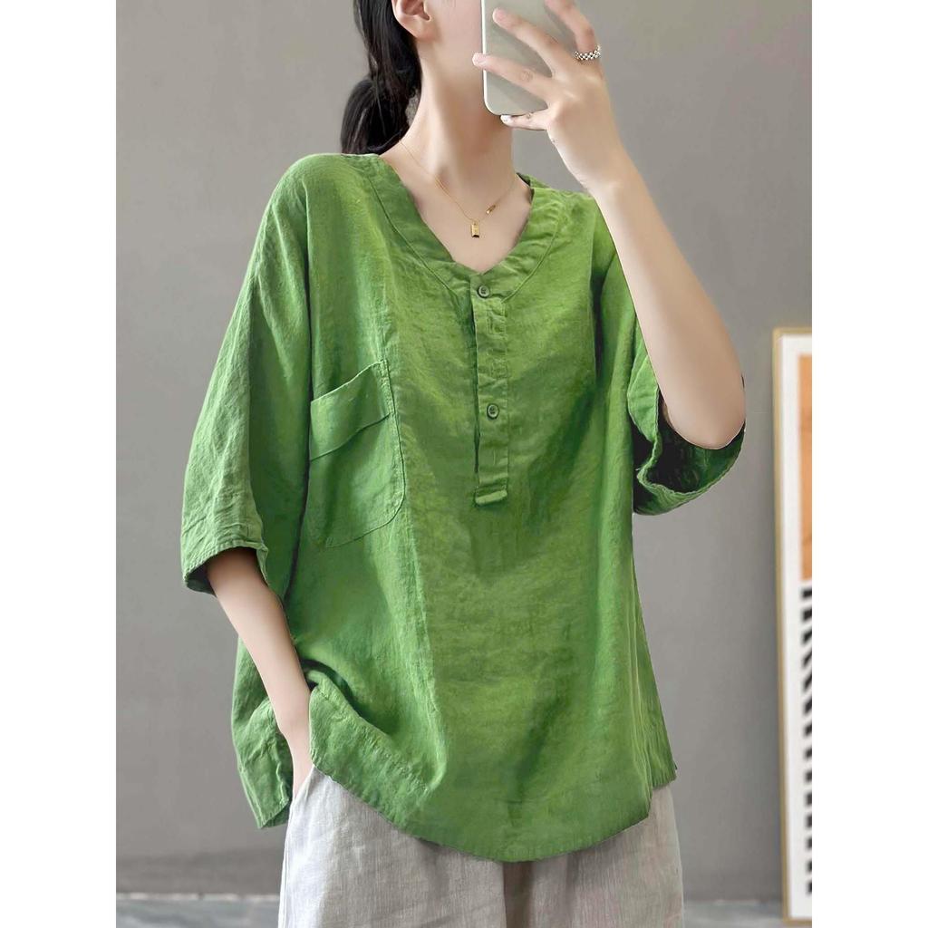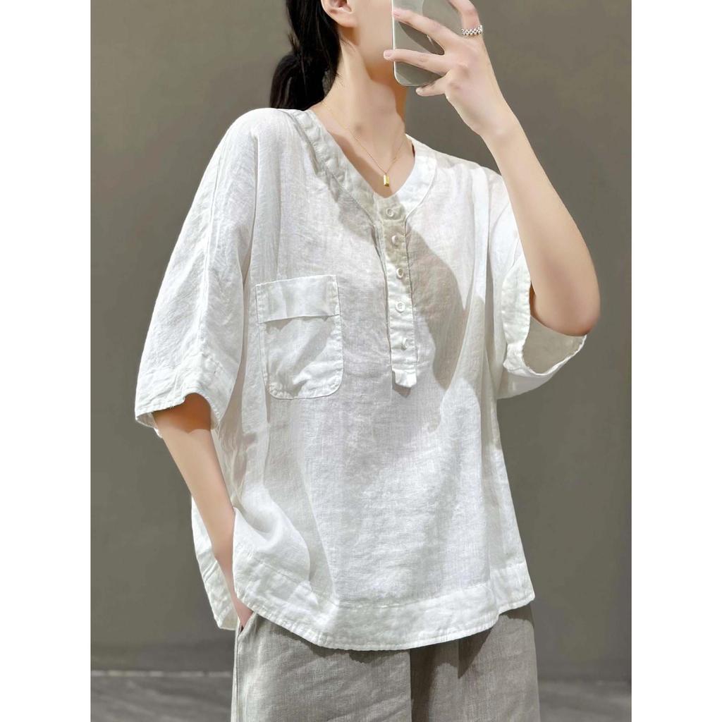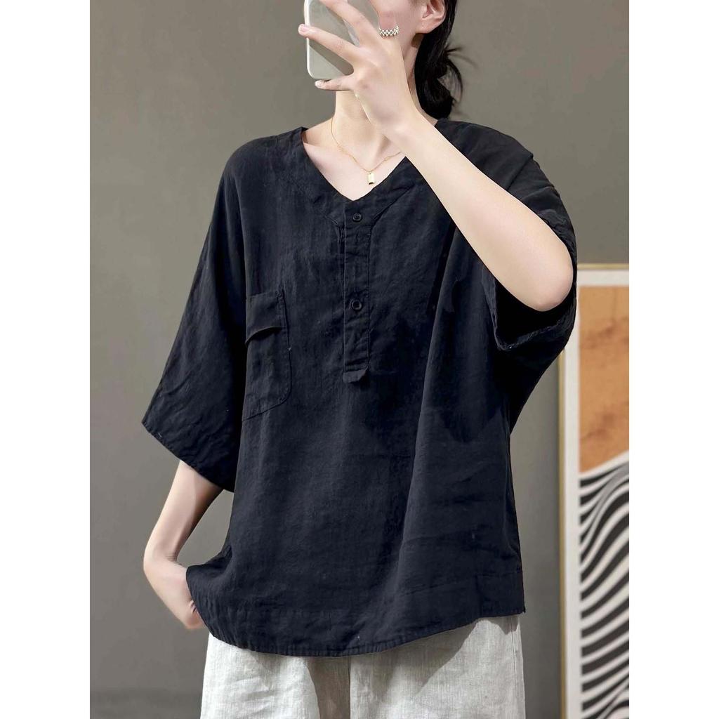 Женская футболка из хлопка и льна, однотонная, с короткими рукавами и карманами, летняя