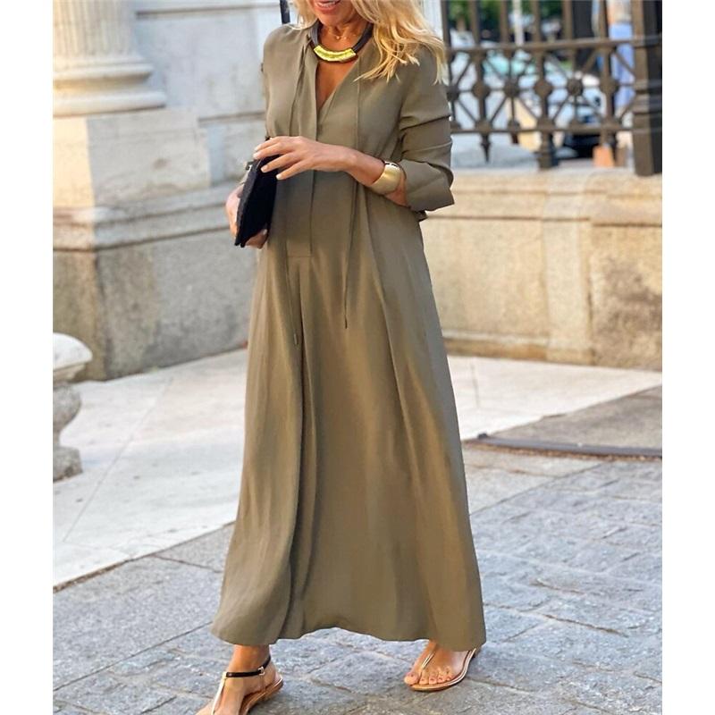 Длинное платье-рубашка с длинными рукавами, однотонным лацканом и большой юбкой