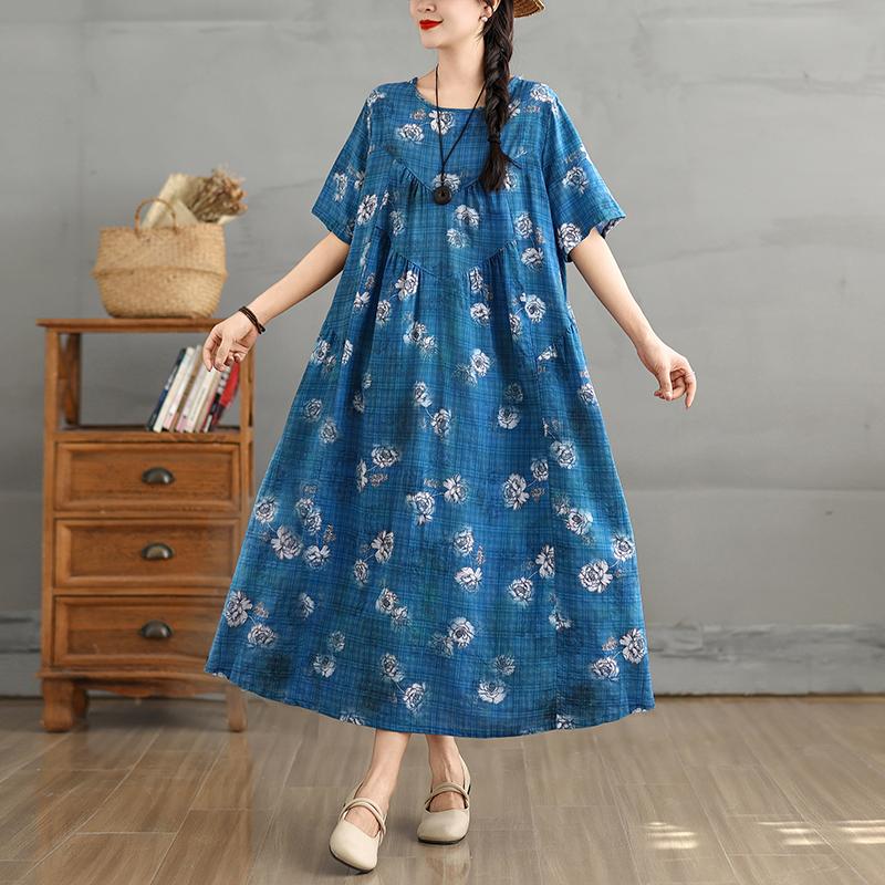 DIMANAF Women 2025 Summer Plus Size Vintage Dress Loose Casual Dress Basic Floral Printing Short Sleeve Long Dress