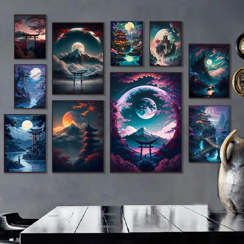 Японский вишневый цвет кои, рыба, лунное озеро, магический арт-постер, холст, живопись, японский пейзаж, настенное искусство для гостиной, декор для дома