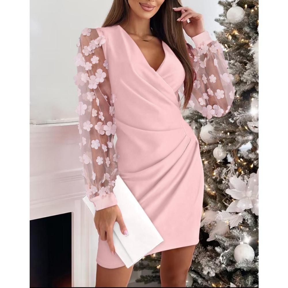 IHUASU Осень-зима V-образный вырез кружева длинный рукав сумка талия платье женщины