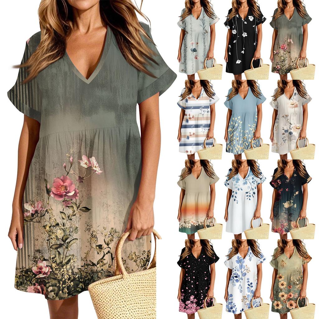 Женское повседневное модное платье с винтажным цветочным принтом и коротким рукавом и V-образным вырезом — купить товар онлайн с бесплатной доставкой по всему миру!